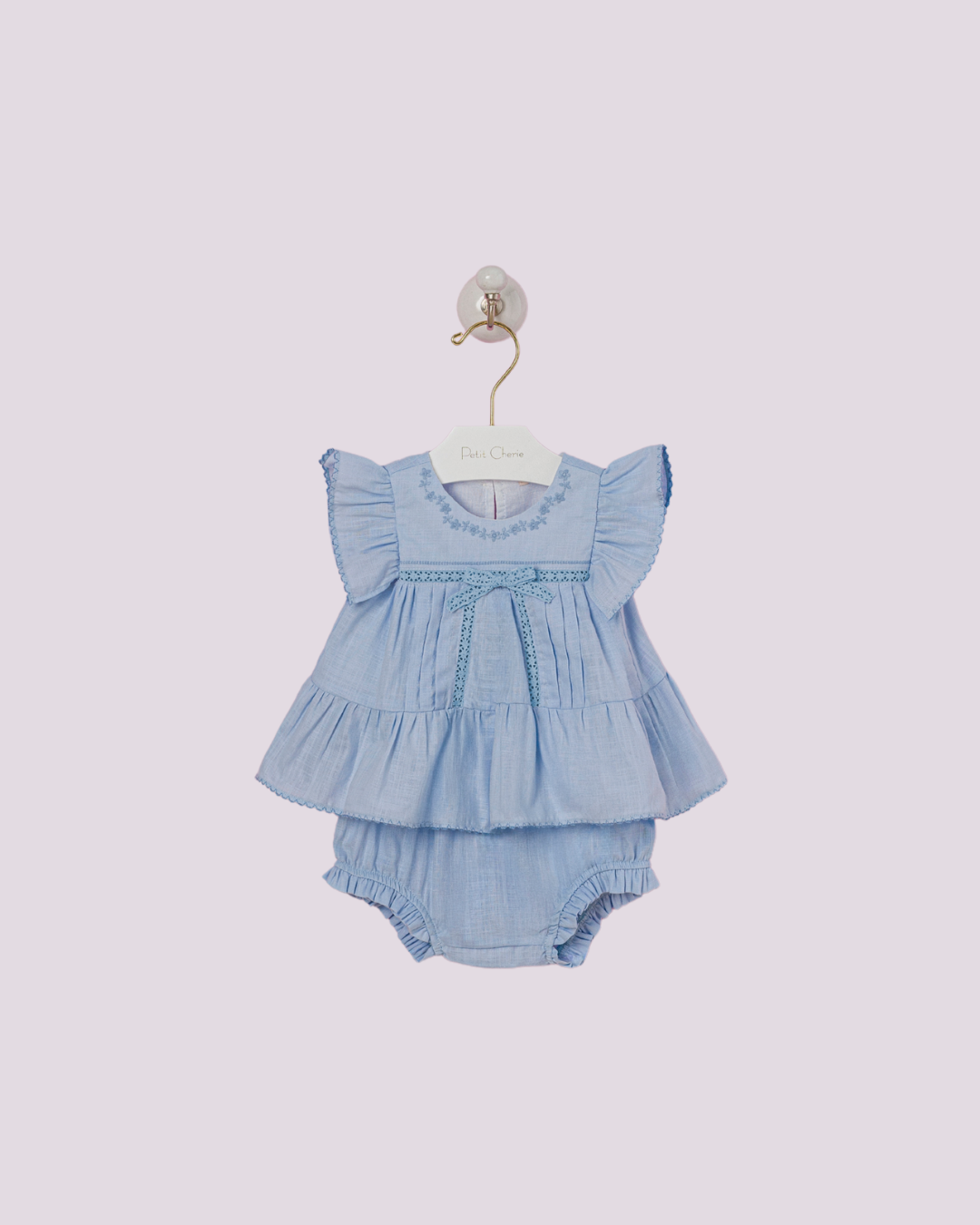 Conjunto bebê Petit Cherie azul com babados e laço, delicado e perfeito para dias de conforto e charme.
