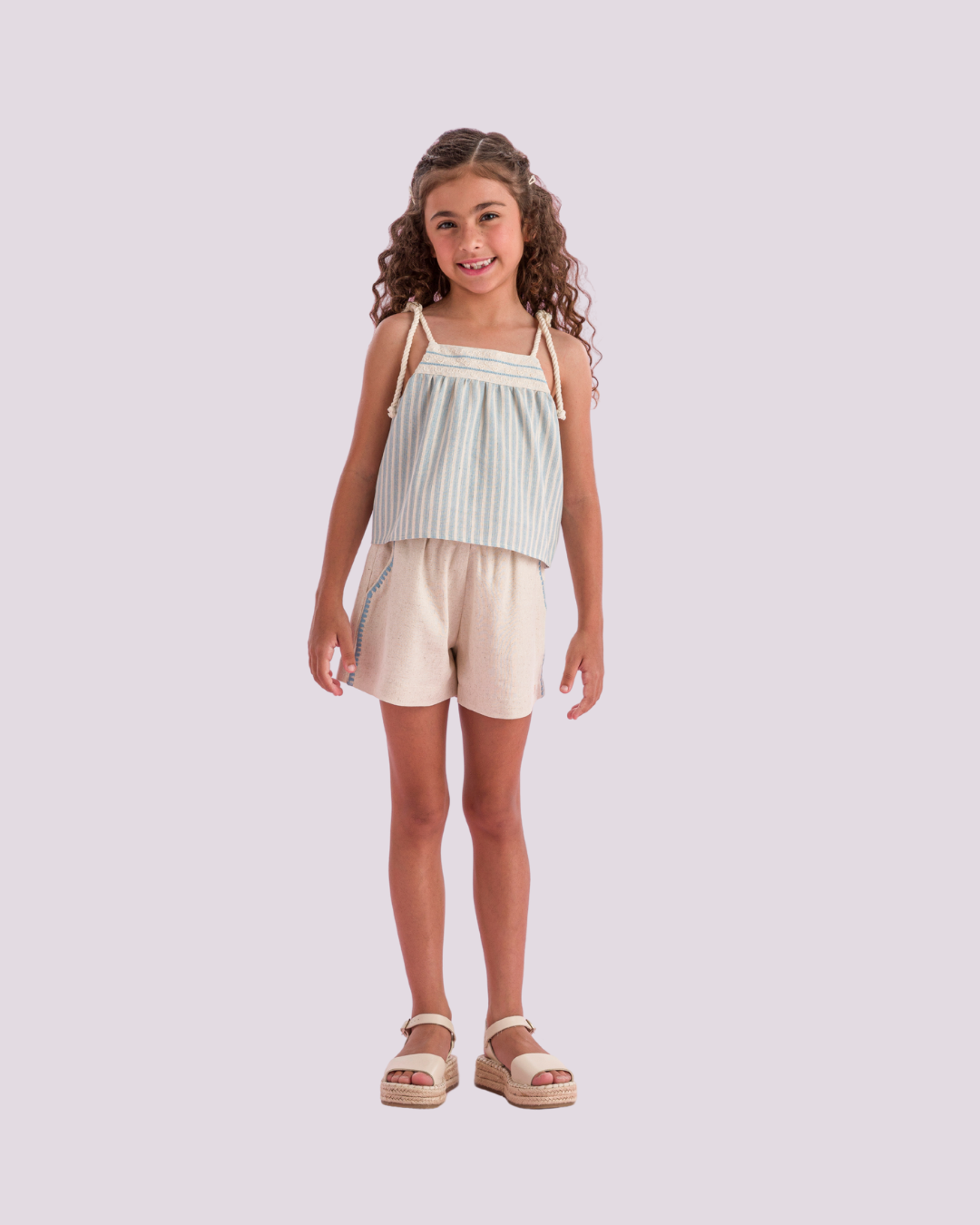 Conjunto Petit Cherie listrado azul com short natural — leve, fresquinho e cheio de estilo para um visual encantador nos dias ensolarados.