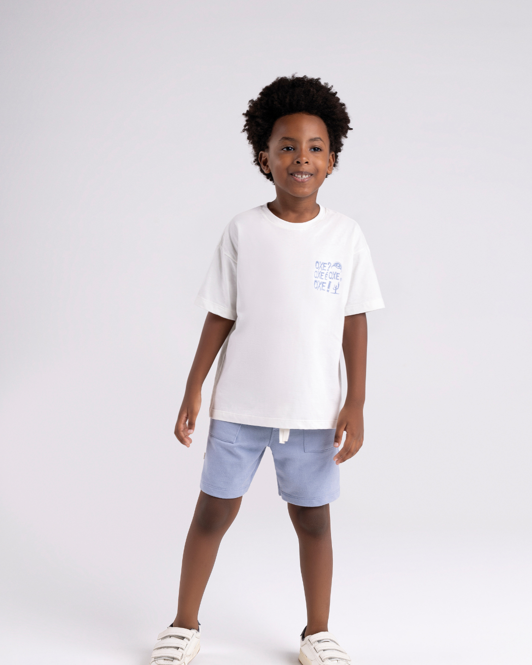 Conjunto infantil casual com camiseta oversized e bermuda leve, ideal para momentos de lazer com conforto e estilo.