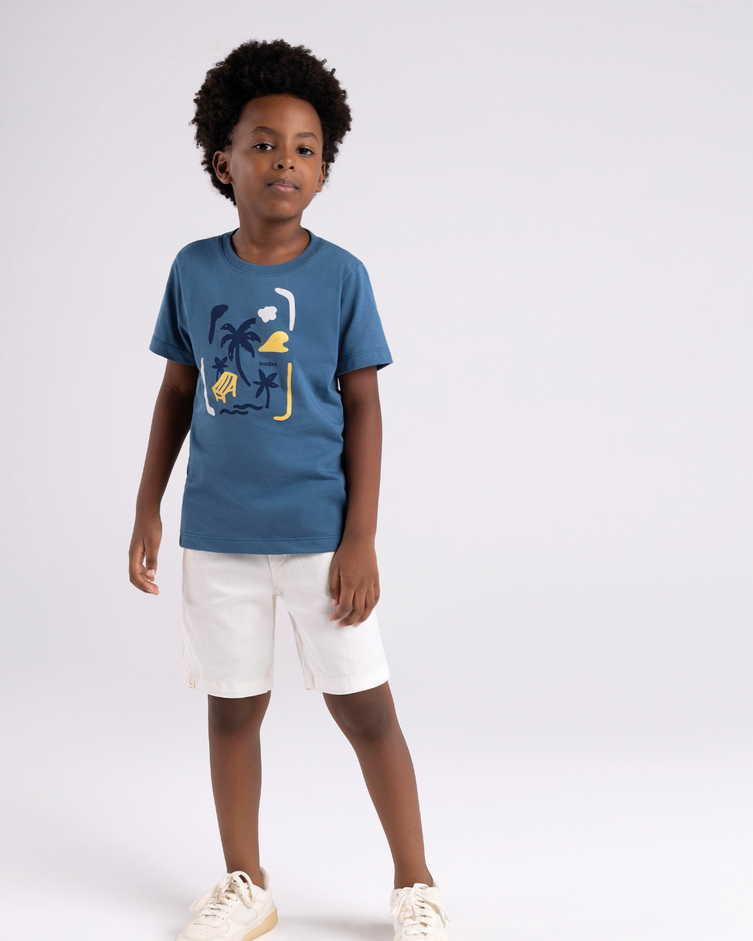 Conjunto infantil com camiseta estampada e bermuda em sarja, leve e confortável para dias de sol e lazer.