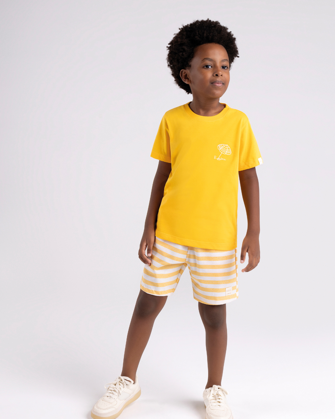 Conjunto infantil casual com camiseta em algodão responsável e bermuda listrada, ideal para dias de diversão com estilo e conforto.