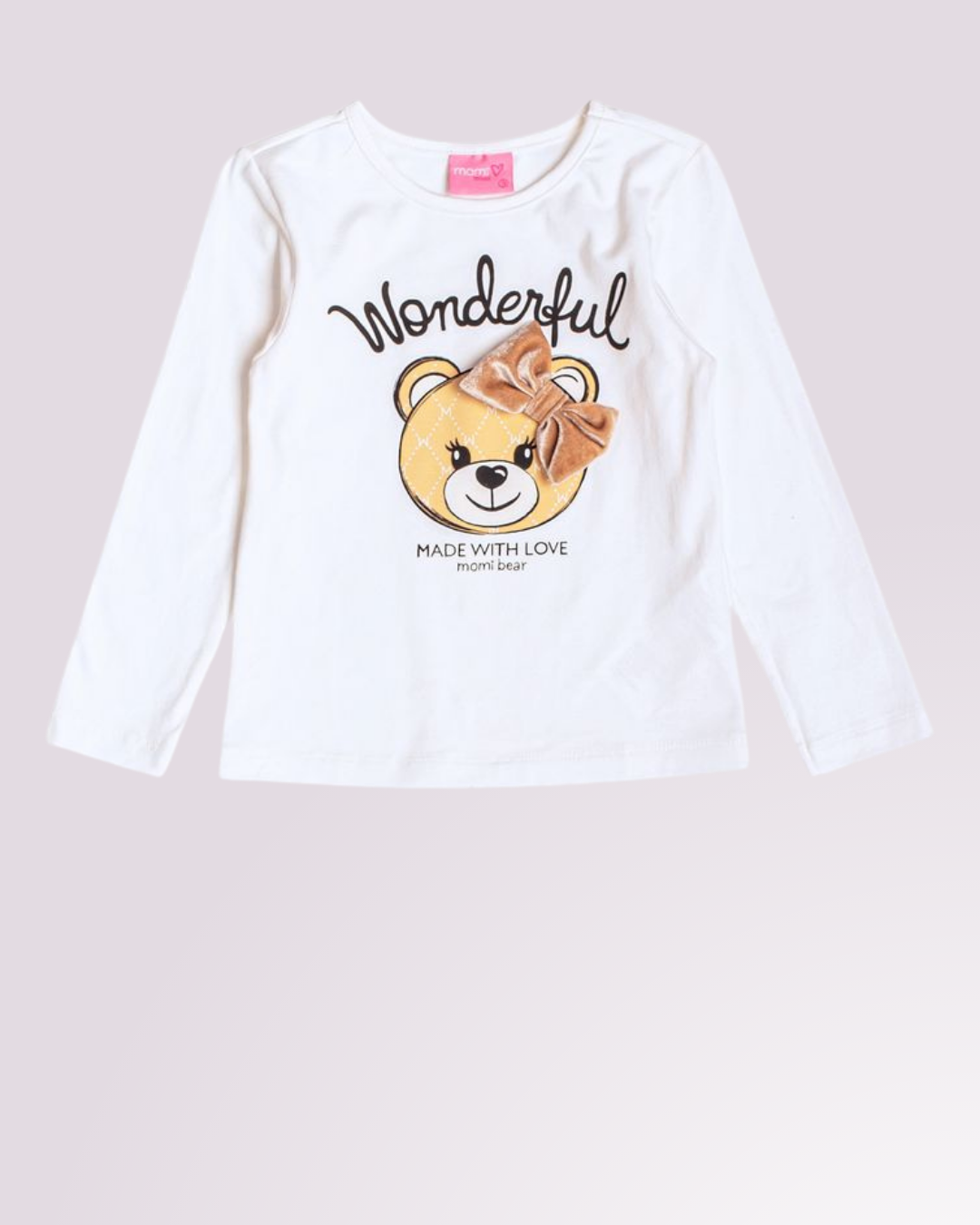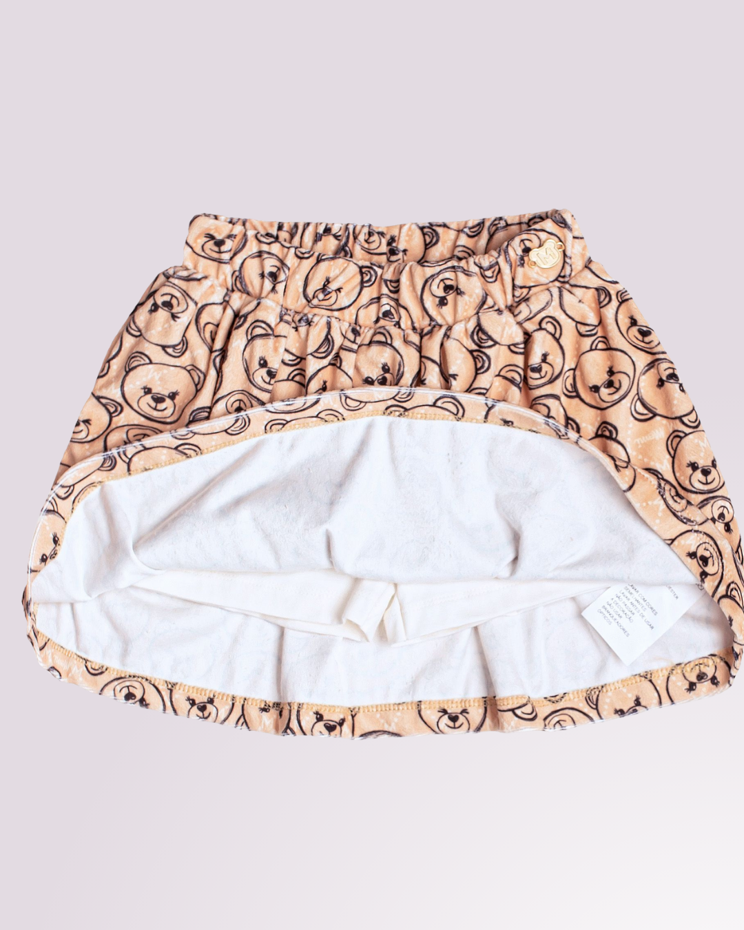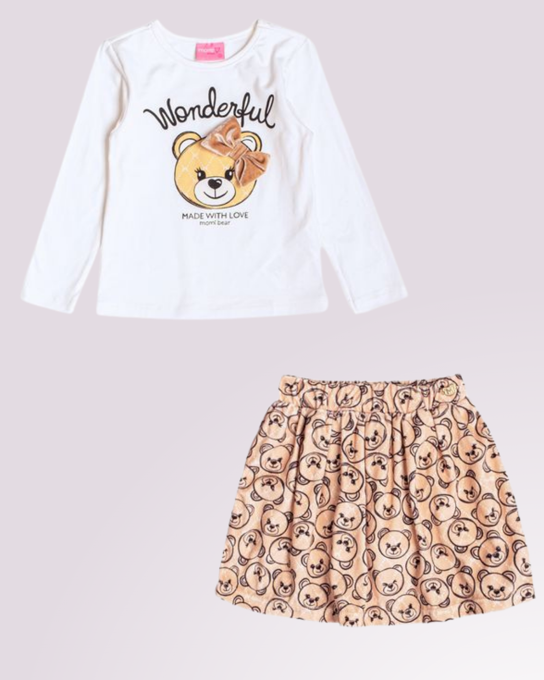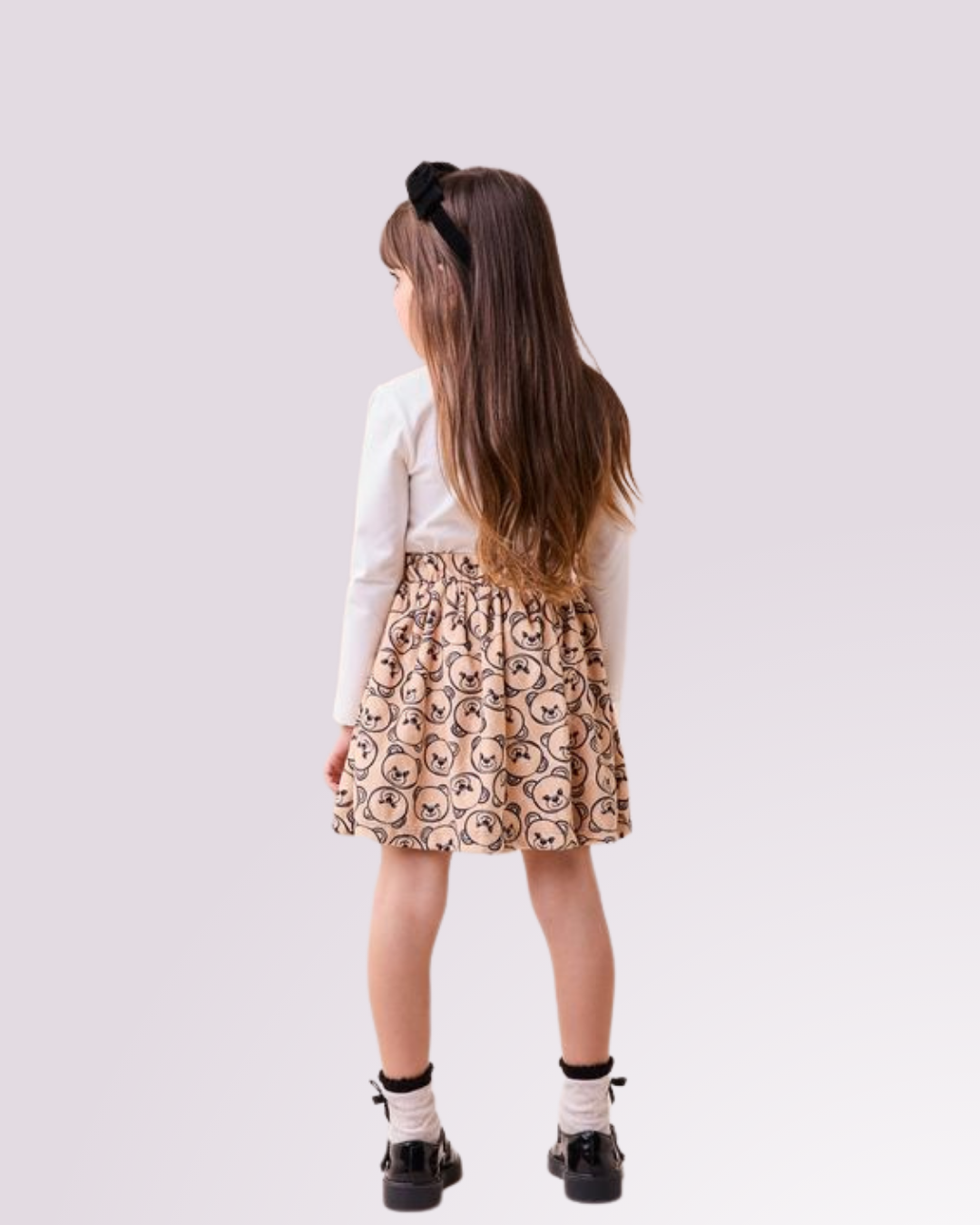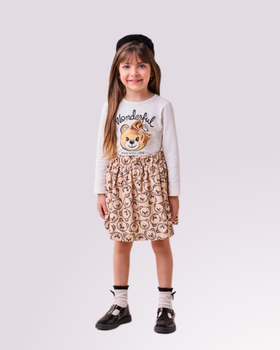 Look encantador com estampa de ursinha e saia divertida, perfeito para momentos especiais com muito conforto e estilo.