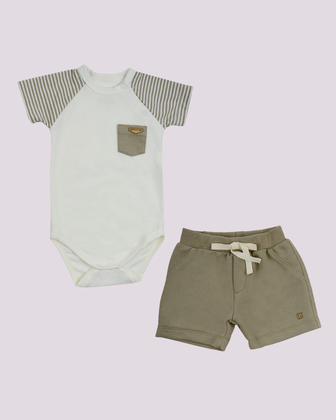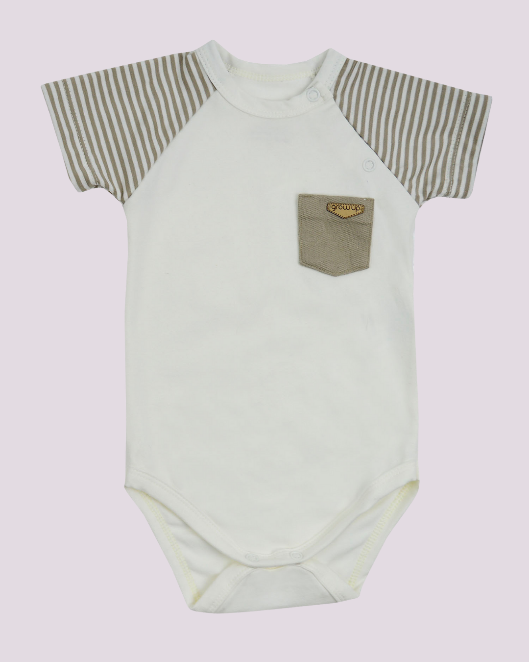 O body traz bolso frontal aplicado e abertura entrepernas com botões de pressão para facilitar as trocas.