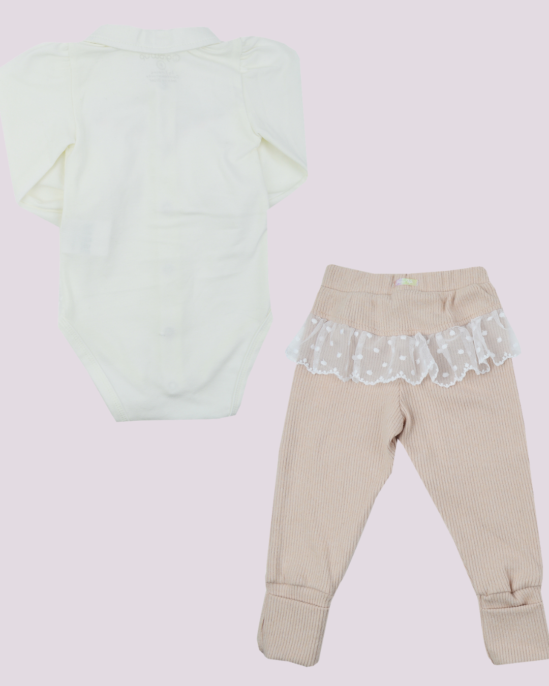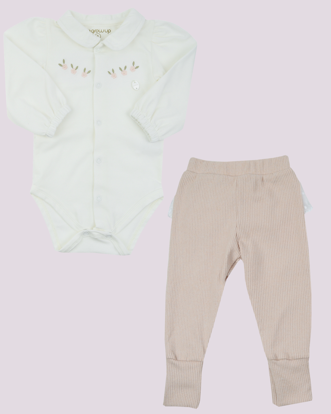 Um look clássico e encantador para o dia a dia da bebê, com bordados florais e calça confortável que une charme e praticidade.
