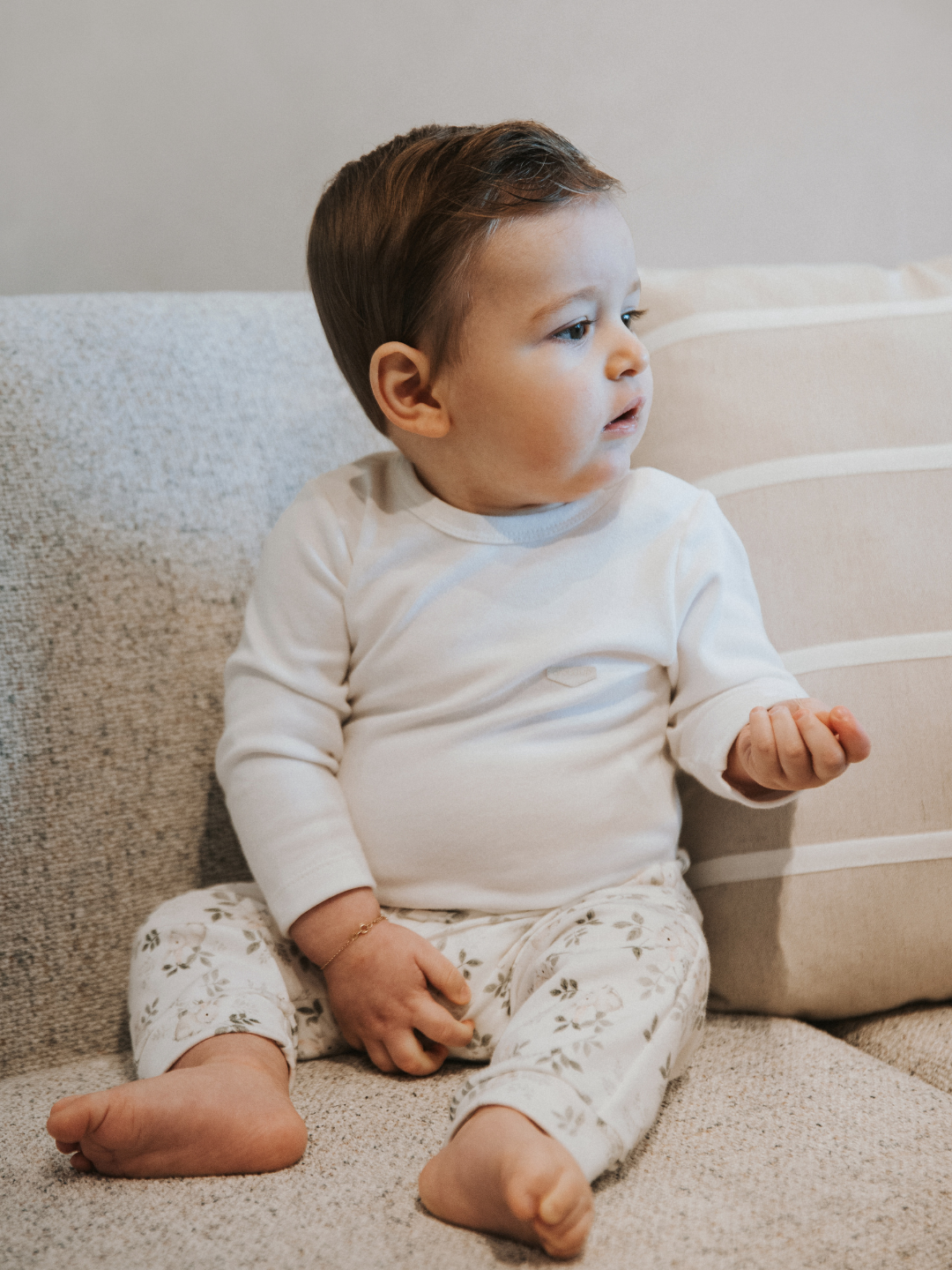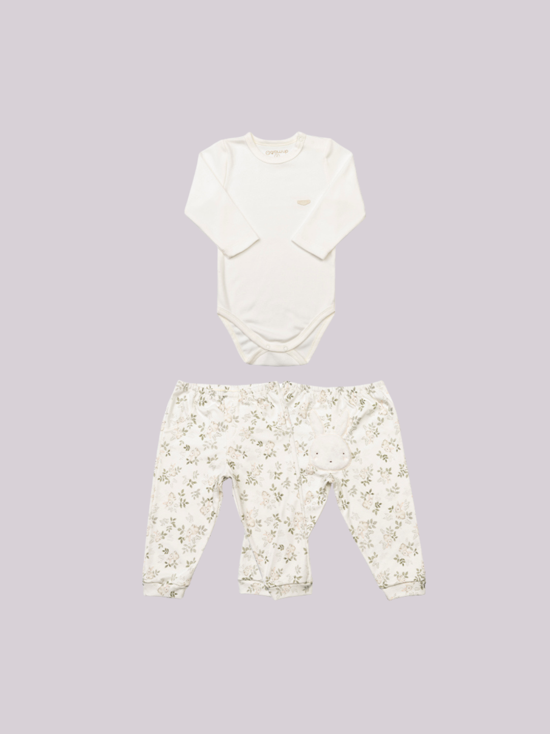Conjunto bebê composto por body e calça, com uma proposta delicada e confortável para o dia a dia. O body em tom off white possui modelagem básica com toque macio e fechamento por botões de pressão, garantindo praticidade. A calça traz estampa suave com elementos da natureza, adicionando um toque lúdico e encantador ao look. Com caimento leve e cós confortável, é perfeito para acompanhar o bebê com aconchego e liberdade de movimento.