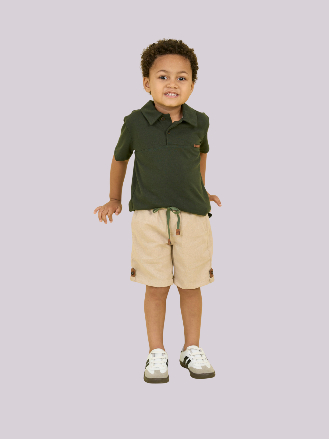 Conjunto infantil com camisa polo verde e short claro, confortável, estiloso e perfeito para qualquer ocasião.