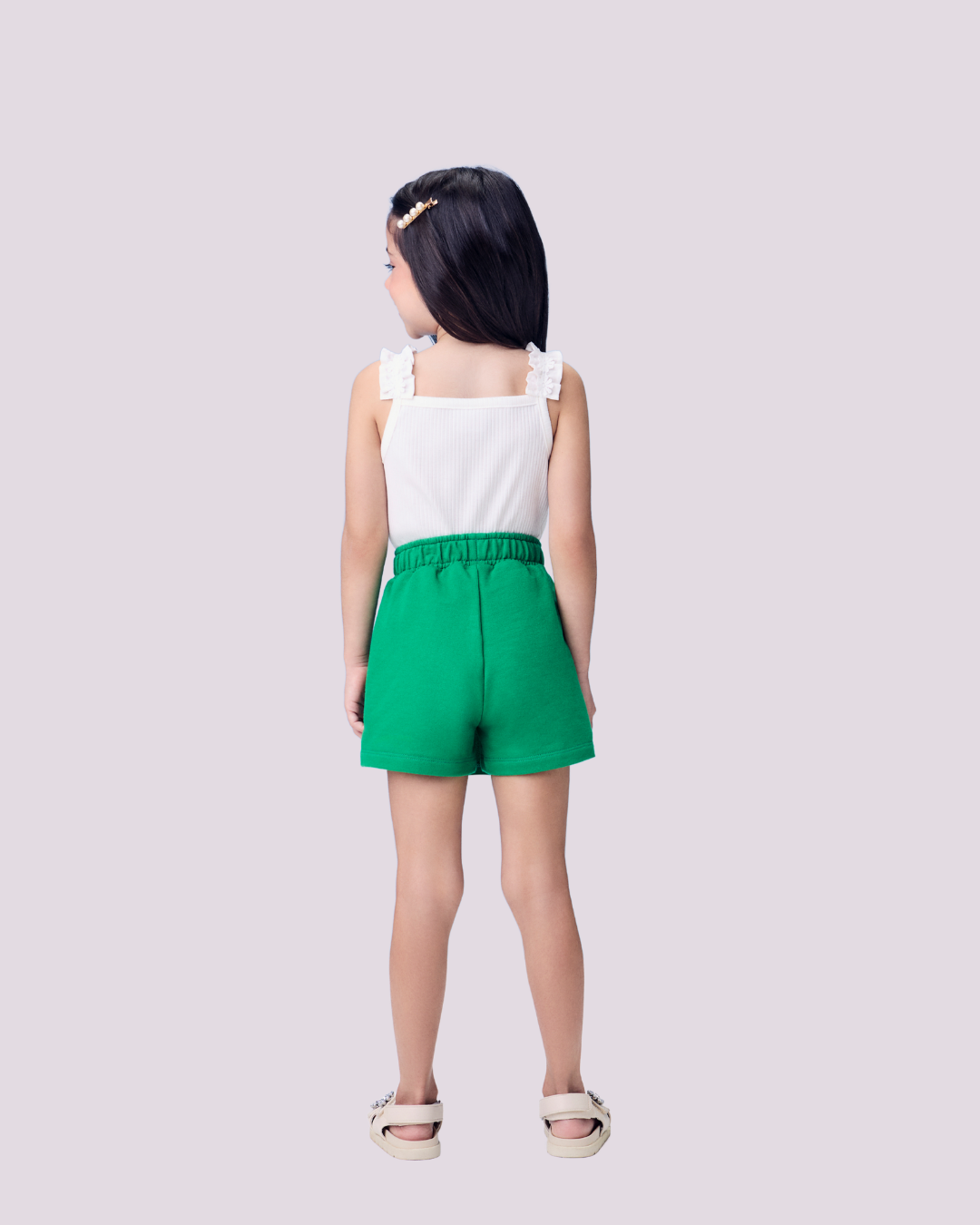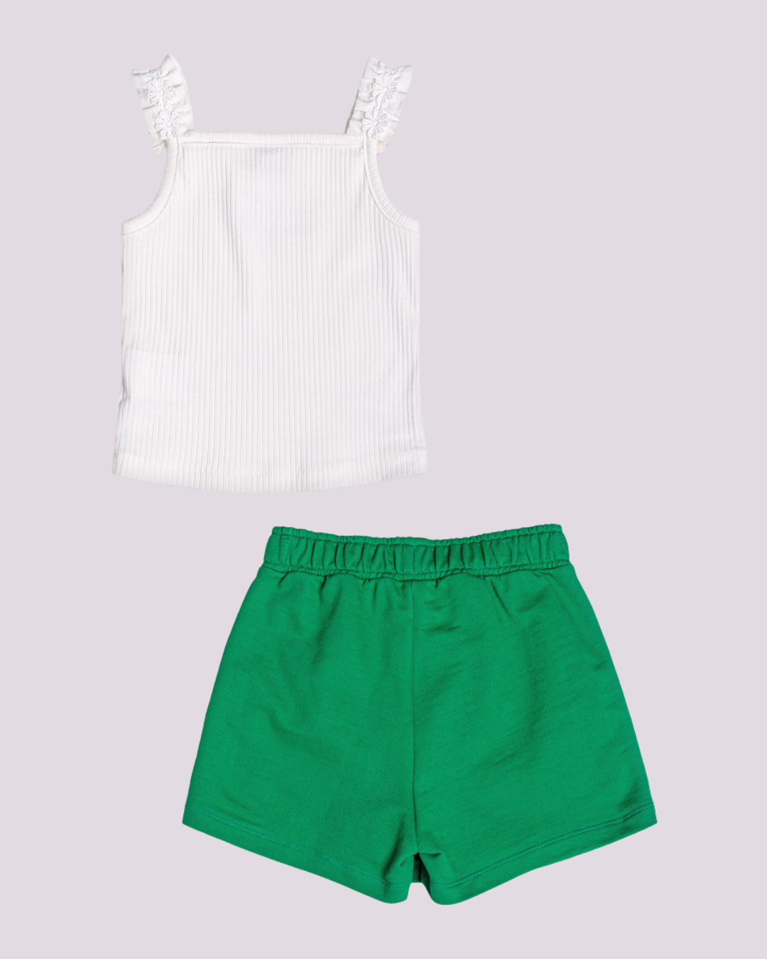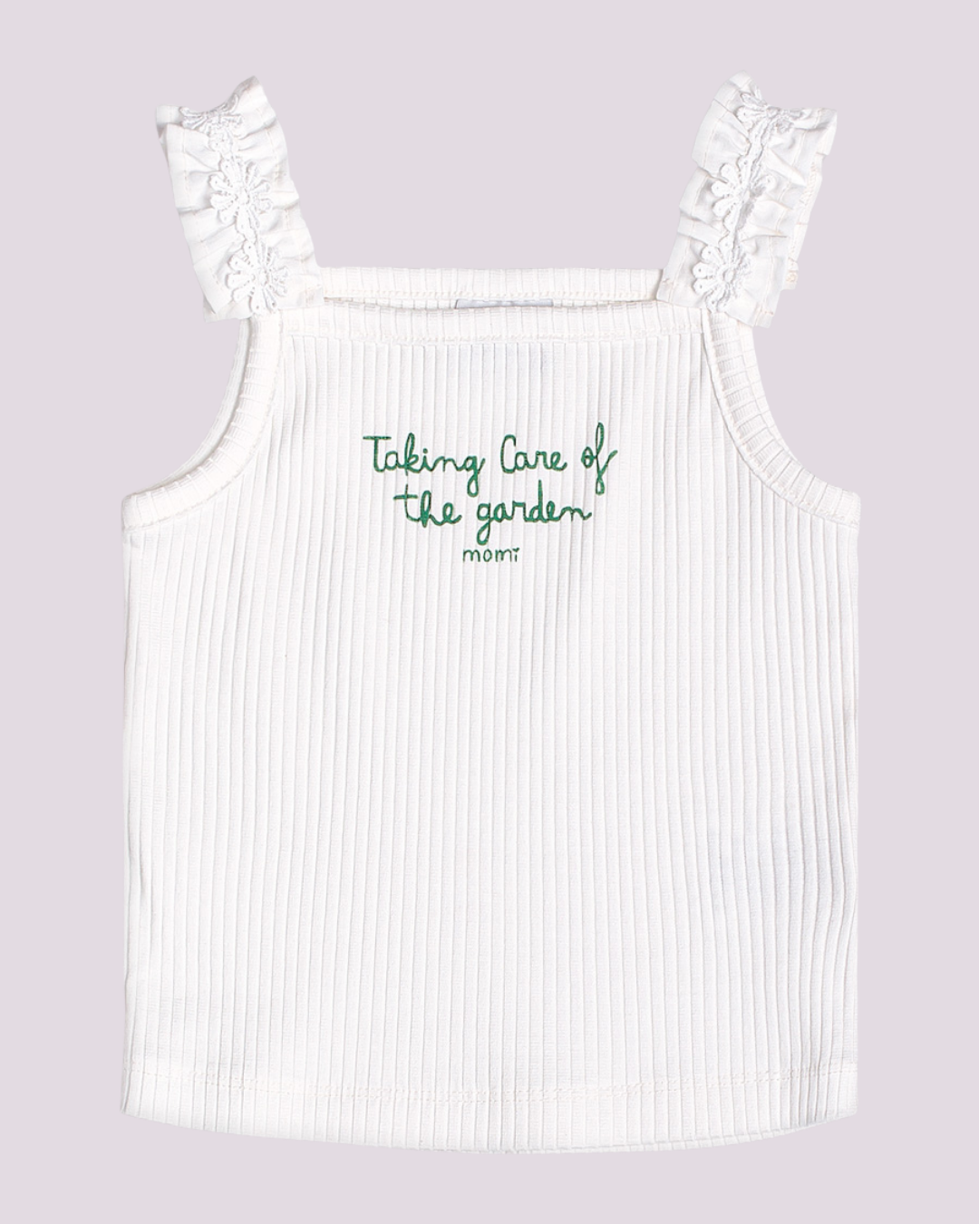 Conjunto infantil composto por regata branca com bordado frontal “Taking care of the garden” e detalhe em laço na alça, acompanhado de saia verde com cós elástico. Um look leve, moderno e confortável, perfeito para o dia a dia ou momentos especiais.