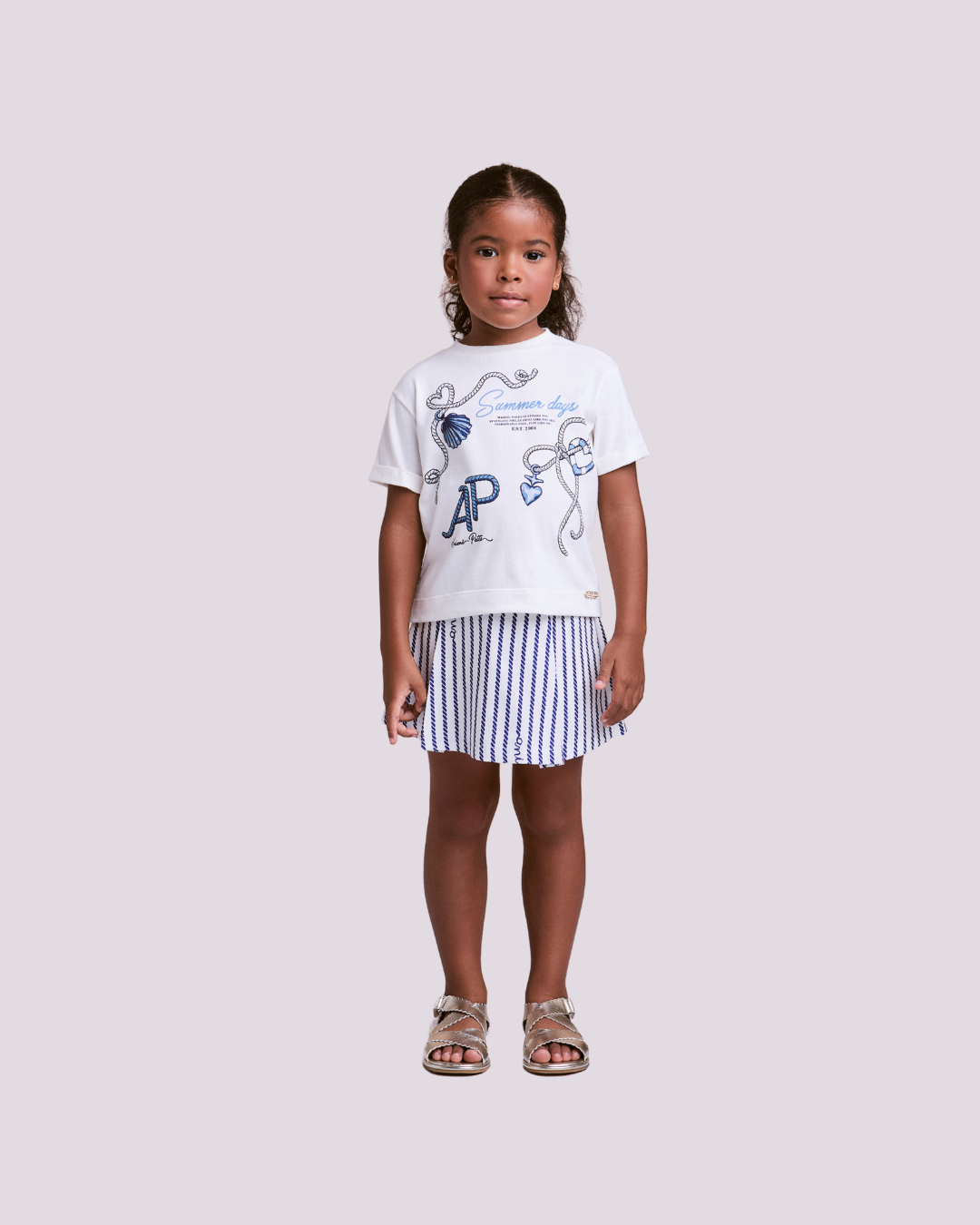 Conjunto Animê com camiseta estampada e saia listrada plissada, moderno e confortável para dias de verão.