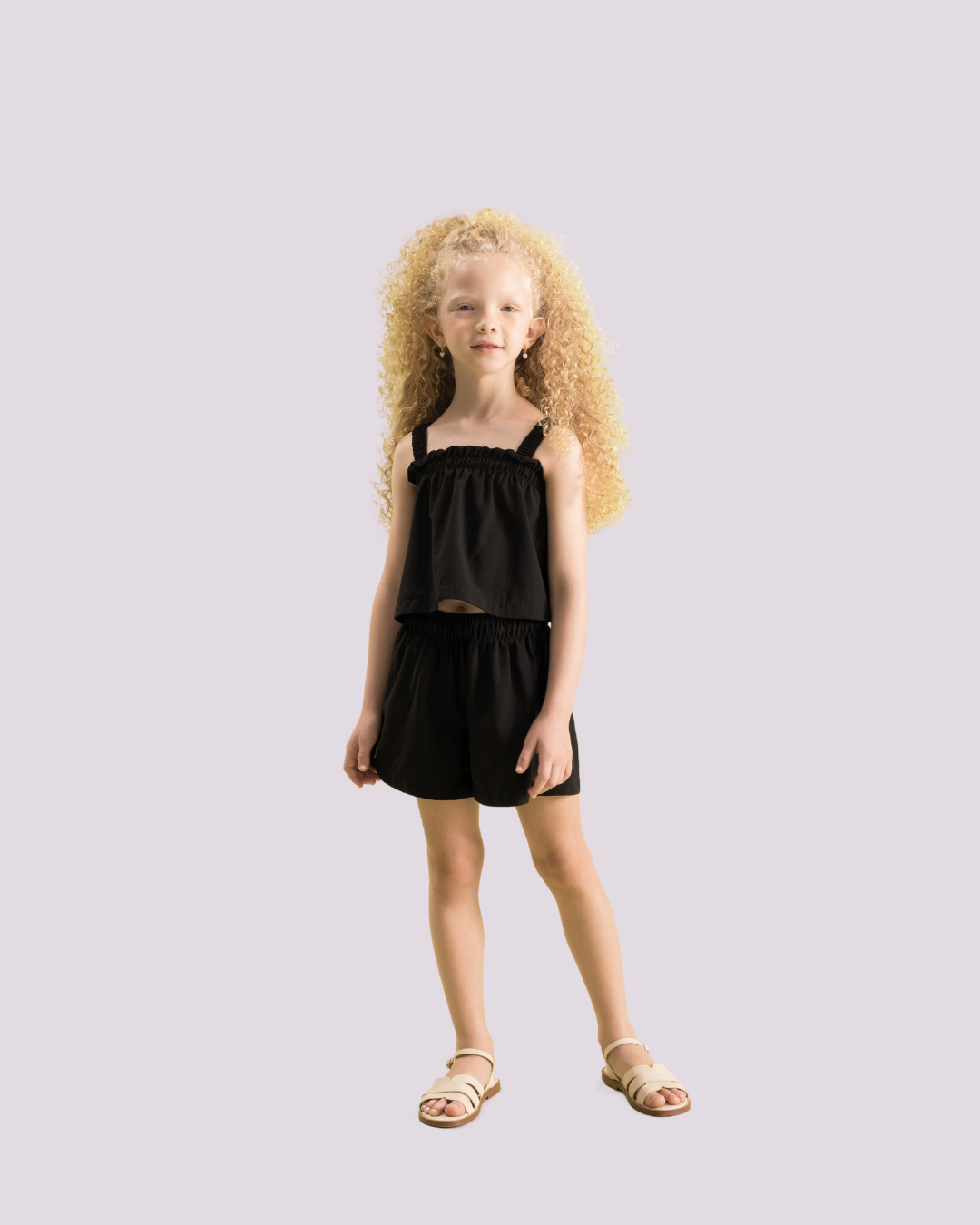 Conjunto infantil da marca Bugbee, composto por blusa de alças finas em tecido leve e shorts preto com cós elástico. O modelo traz sofisticação com simplicidade, garantindo conforto e liberdade de movimento. Uma peça versátil, ideal para compor looks modernos e cheios de estilo, perfeita tanto para passeios casuais quanto para ocasiões especiais.