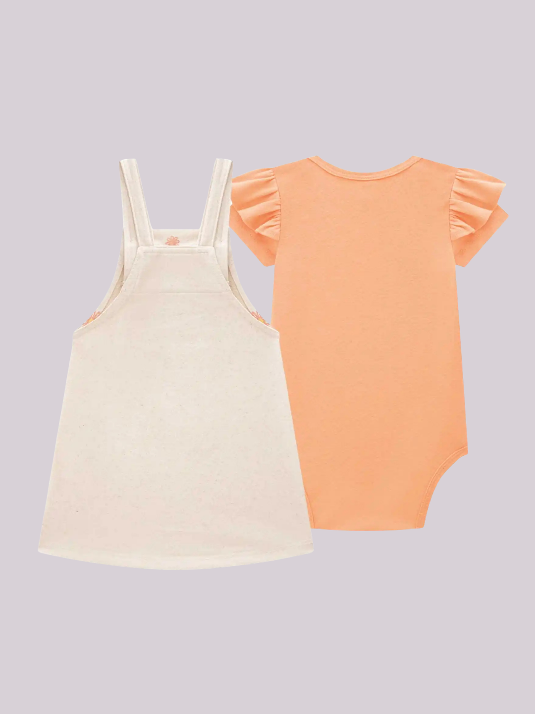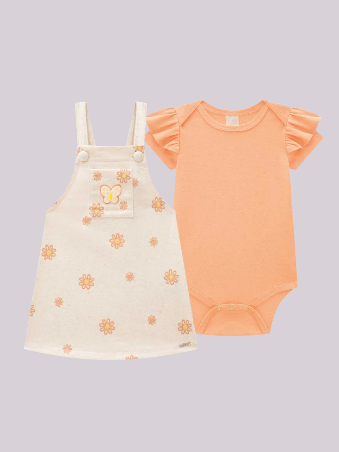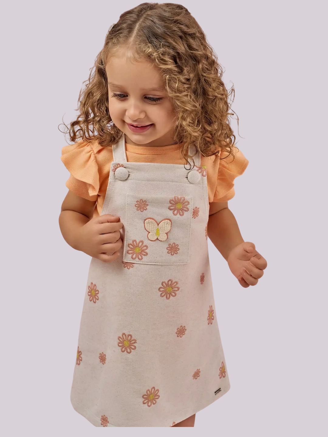 Conjunto com salopete bordada de margaridas e borboleta + blusa pêssego, delicado, confortável e cheio de charme.