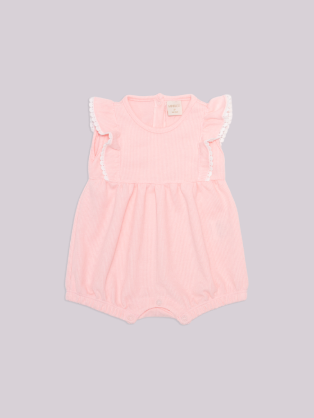 Macacão curto em malha canelada rosa, com babados delicados e acabamento em picueta. Conforto e charme para o bebê. Mini & Co 💕✨