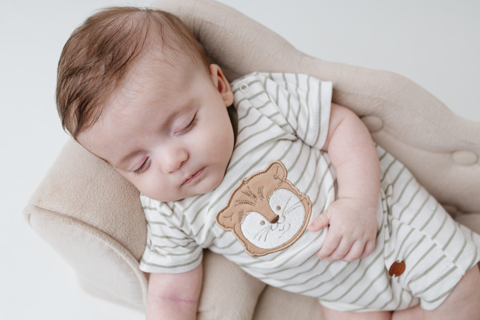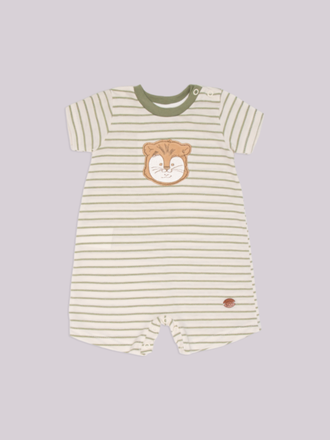 Macacão curto em malha macia, com listras delicadas e aplique de leão. Conforto e charme para o dia a dia do bebê. Mini & Co 🦁✨