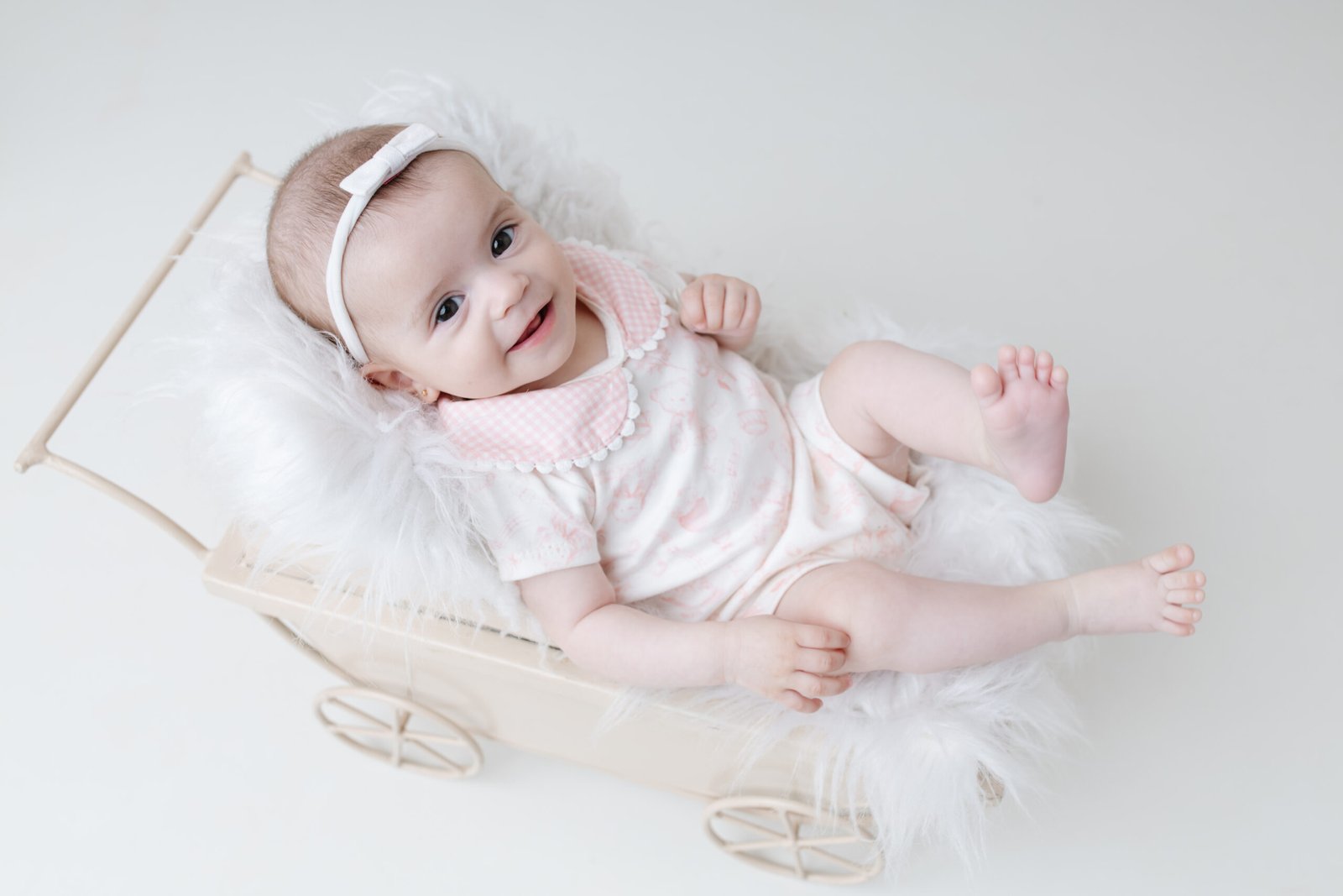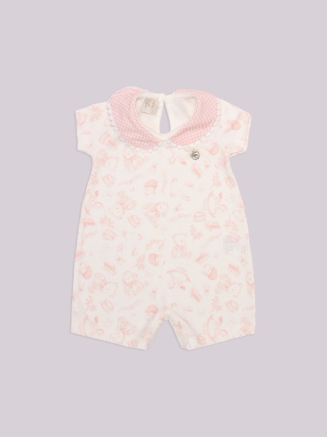Macacão curto em malha macia, com estampa delicada e gola xadrez rosa. Ideal para dias leves e cheios de conforto. Mini & Co 🎀✨