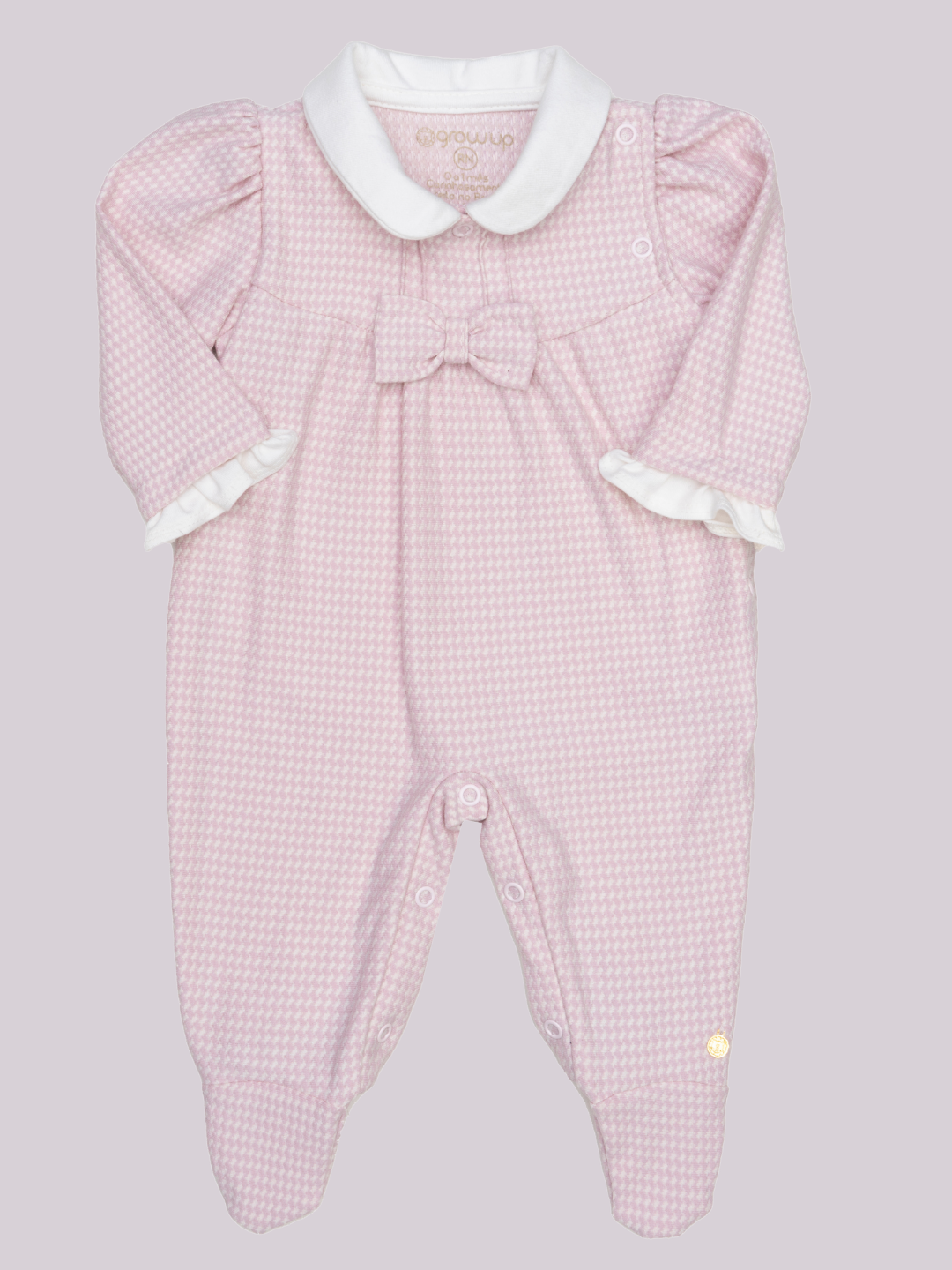 Macacão rosé com gola branca e laço frontal, delicado e elegante para o bebê.