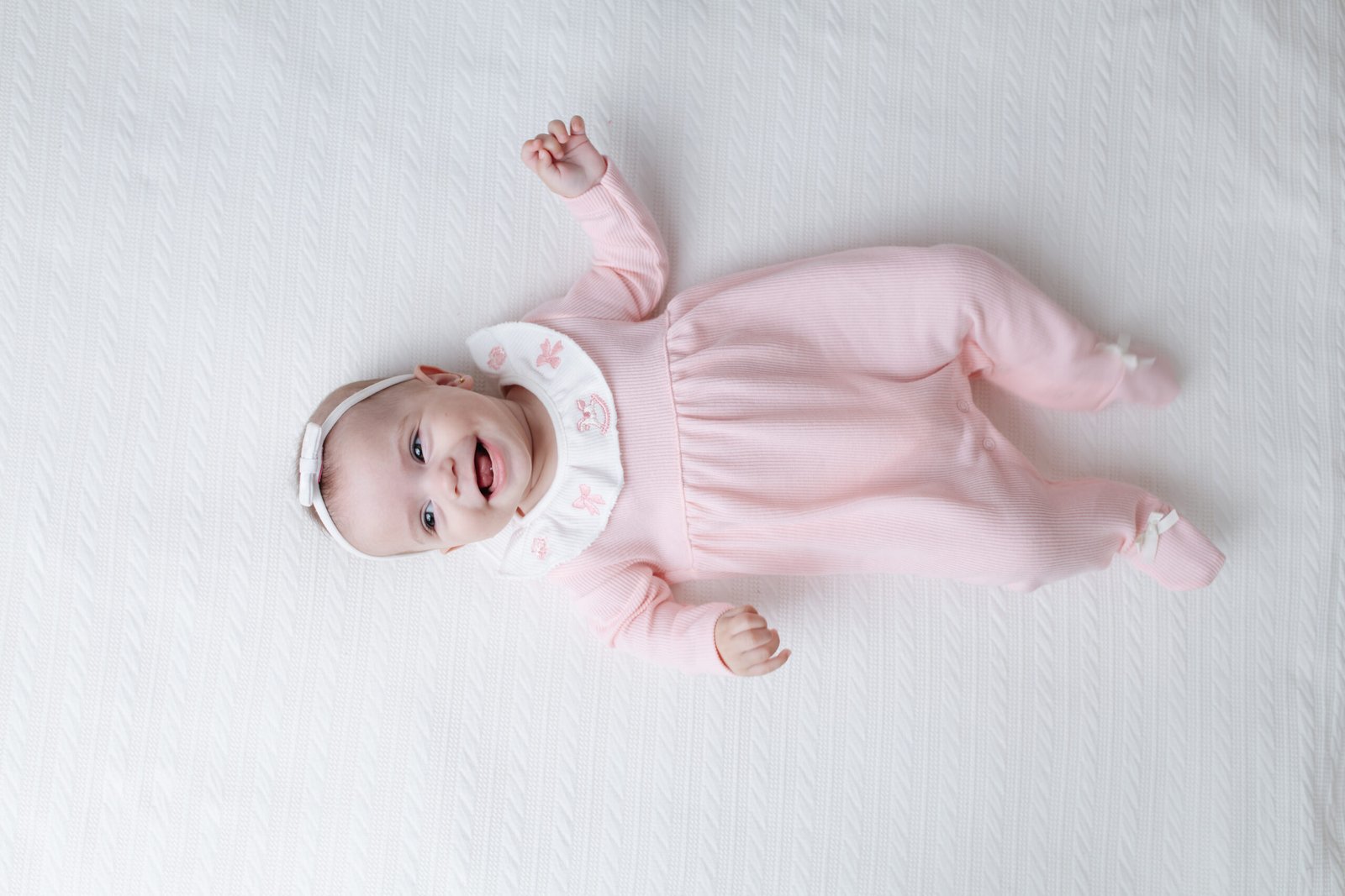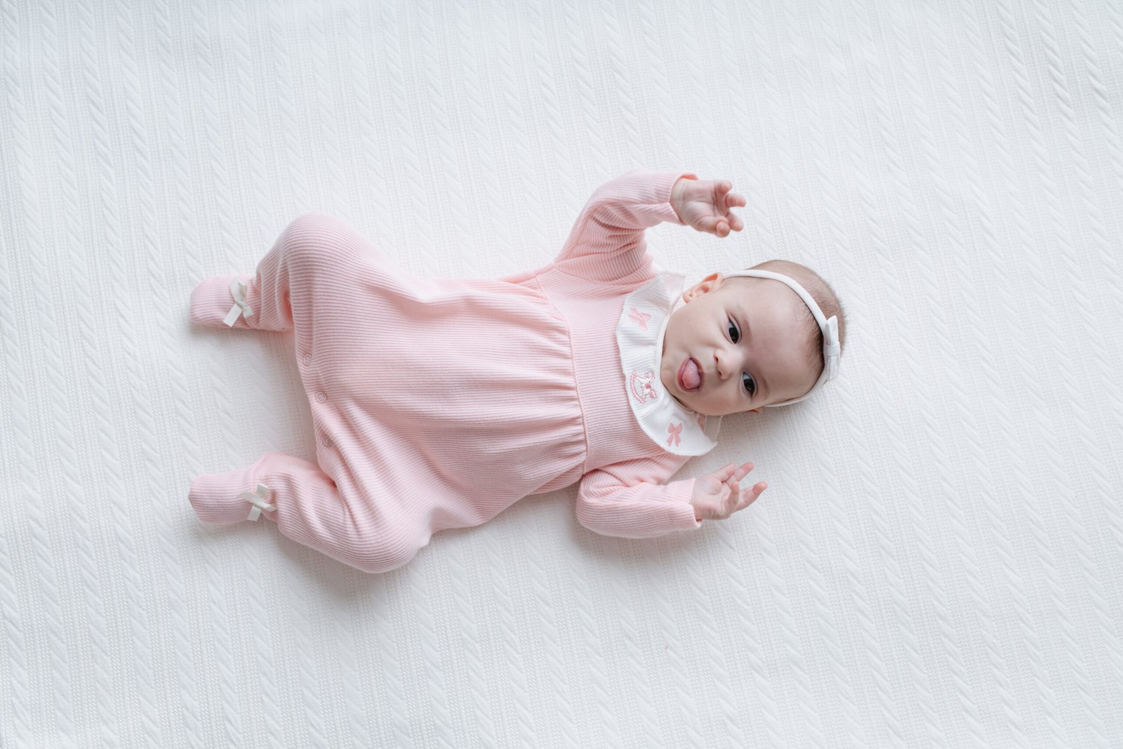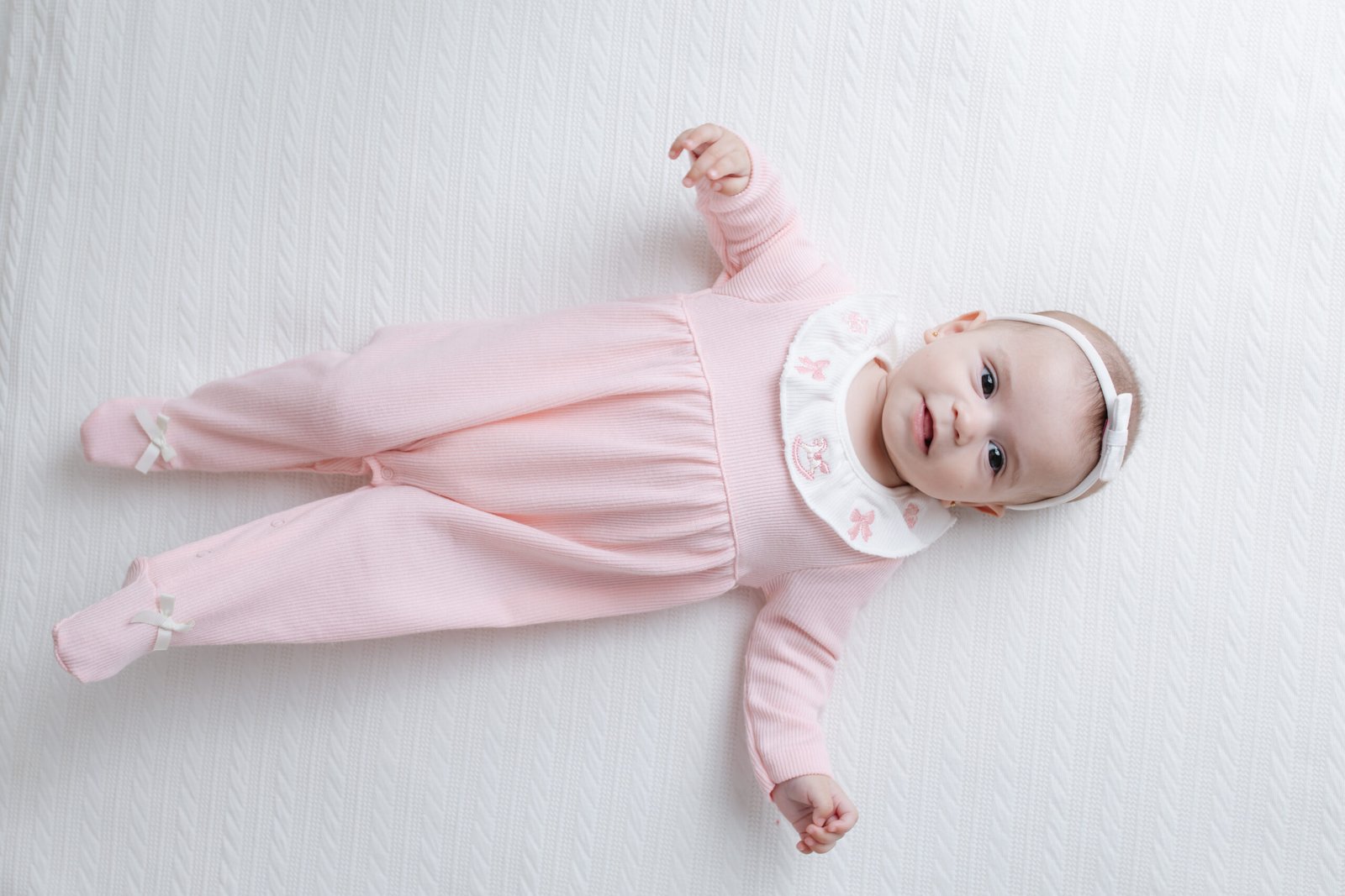 Macacão longo em malha macia rosa, com gola bordada e detalhes delicados. Conforto e carinho para o bebê. Mini & Co 💕✨