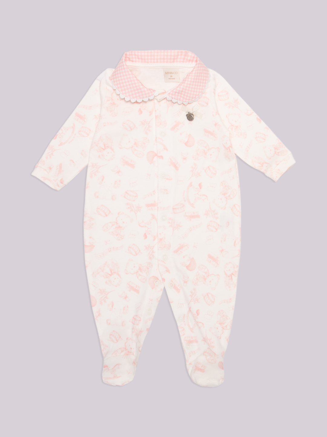 Macacão longo em malha macia, com estampa delicada e gola xadrez rosa. Conforto e charme para o enxoval do bebê. Mini & Co ✨🎀