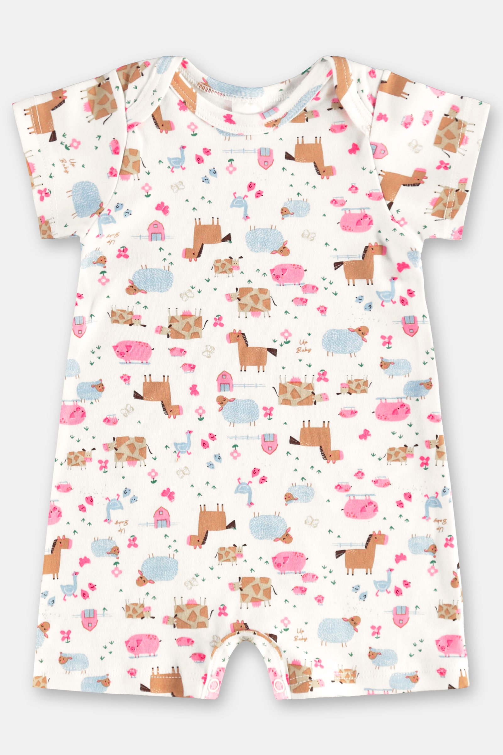 Macacão curto Up Baby com estampa colorida e divertida — conforto, leveza e fofura para o dia a dia dos pequenos.