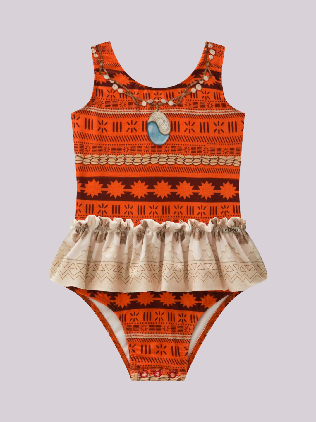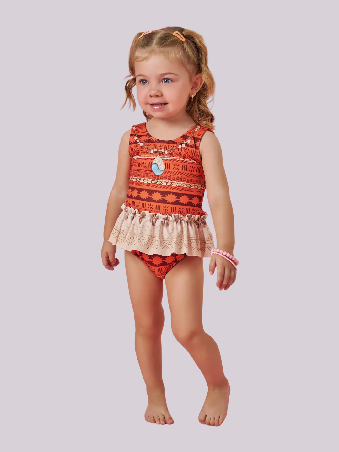 Maiô infantil inspirado na personagem Moana, com estampa étnica em tons vibrantes de vermelho e detalhes que remetem ao visual da heroína aventureira. Possui babado delicado na cintura em tom contrastante, trazendo leveza e movimento à peça. Ideal para pequenas exploradoras que amam praia, piscina e dias cheios de diversão, com conforto e liberdade para brincar.
