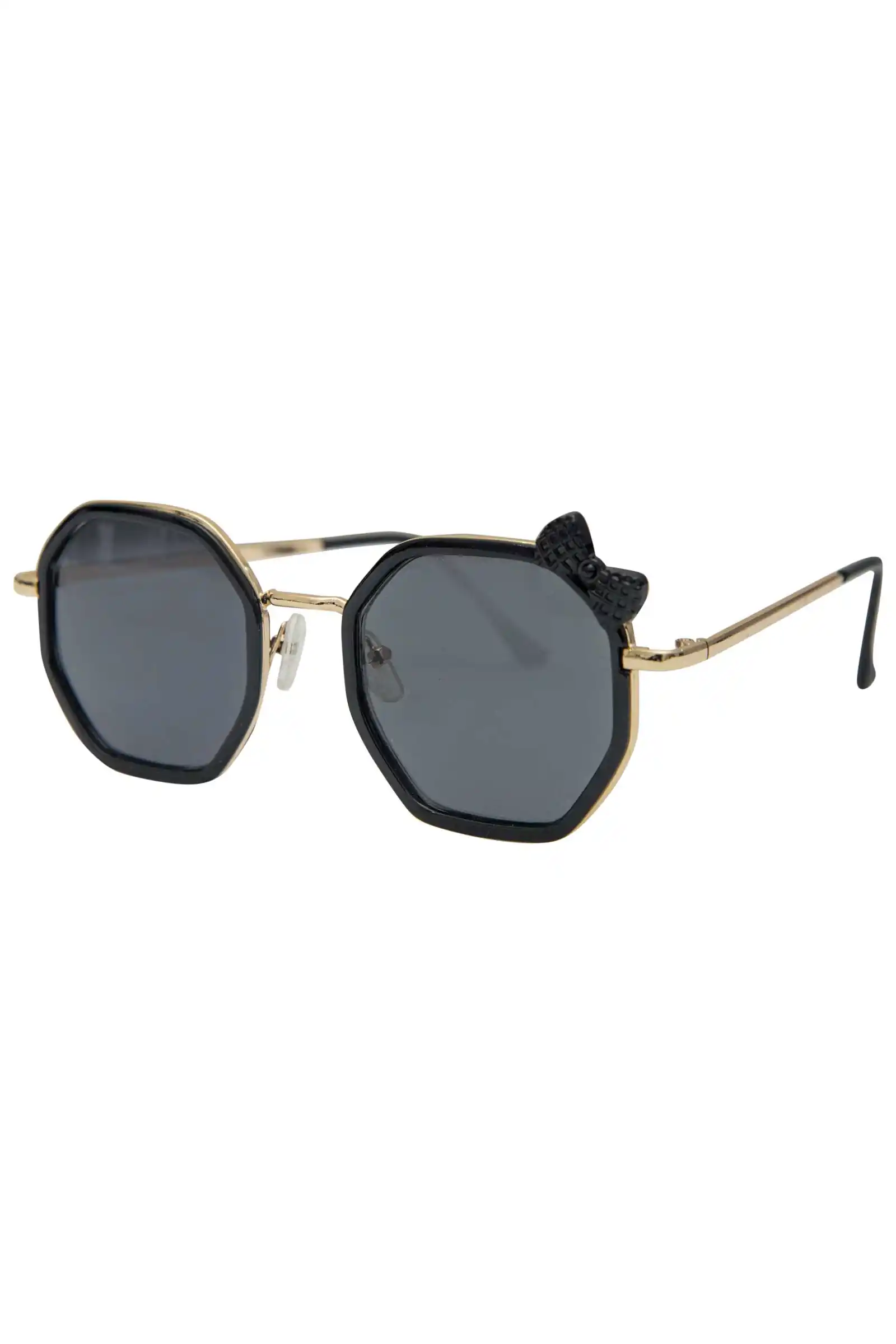 Óculos infantil fashion com armação preta em formato geométrico e delicado detalhe de laço no canto superior, trazendo um toque moderno e divertido ao visual. As lentes escuras garantem proteção contra os raios solares, enquanto as hastes finas douradas adicionam elegância à peça. Perfeito para completar looks cheios de personalidade e estilo.