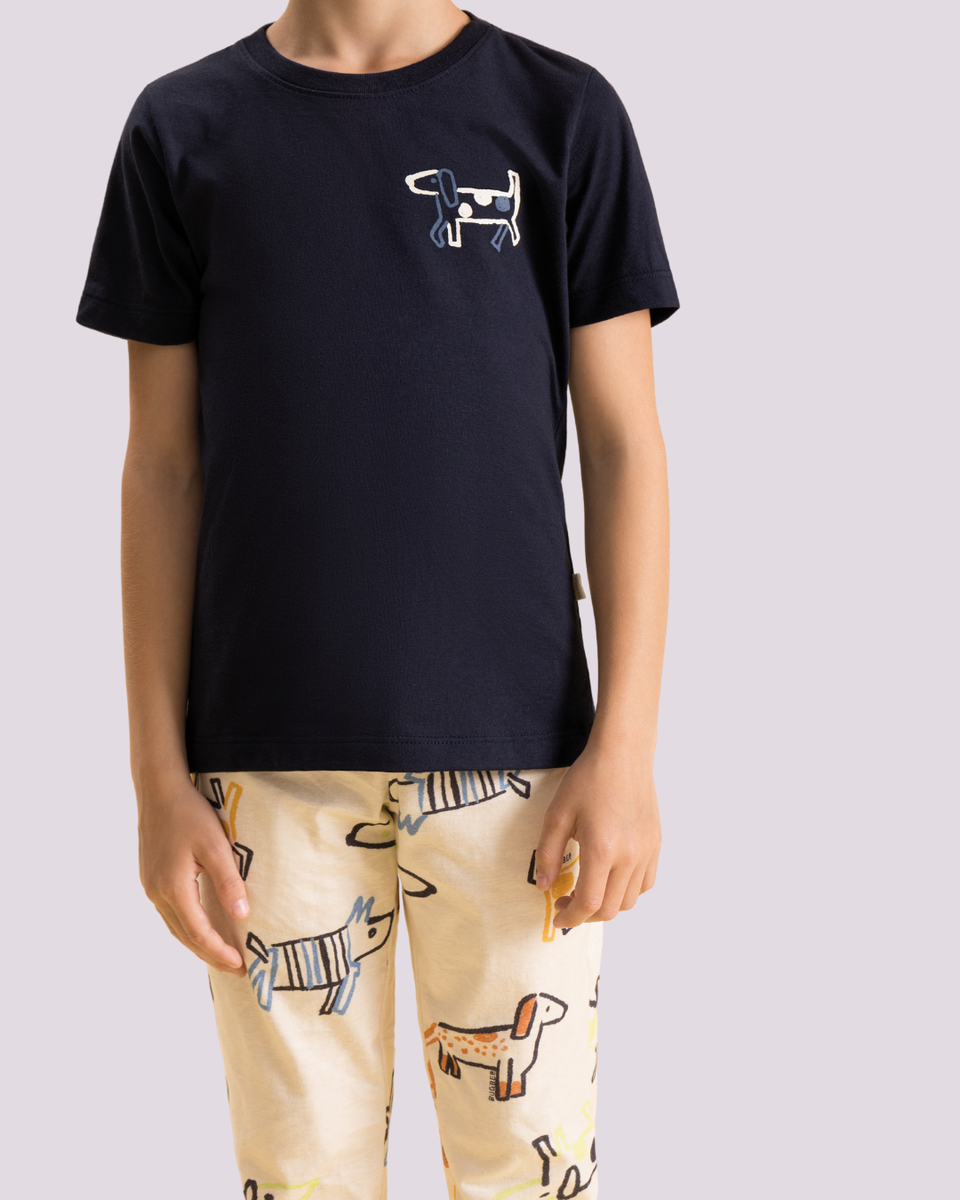 Pijama masculino Bugbee com camiseta azul marinho e calça estampada de cachorrinhos, confortável e divertido.
