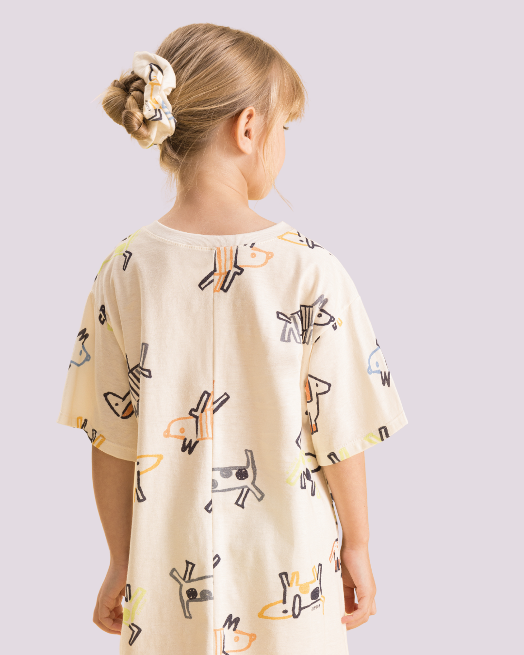 Pijama oversized Bugbee estampado com cachorrinhos e scrunchie, divertido e confortável para dormir com estilo.