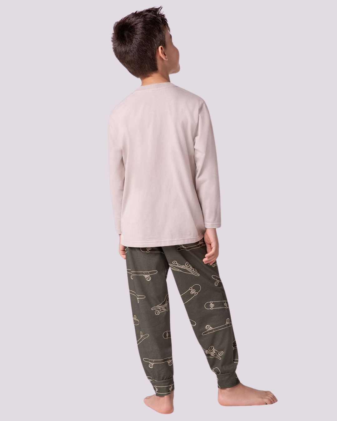 Pijama infantil masculino da marca Lupo, composto por blusa básica de manga longa em tom claro e calça com estampa de skates em fundo verde escuro. A calça possui modelagem confortável com punho na barra, ideal para noites tranquilas e cheias de estilo. Confeccionado em malha macia, garante liberdade de movimento e aconchego para os pequenos.