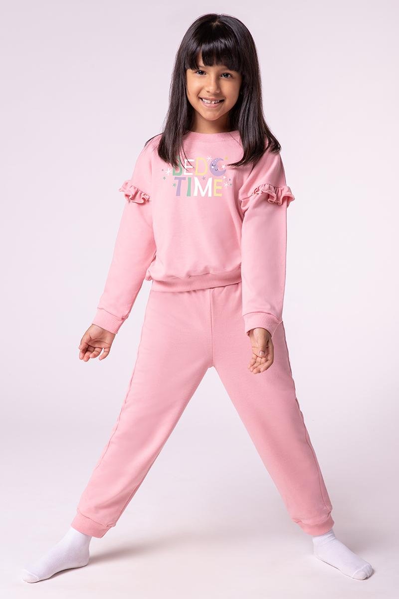 Pijama Lupo com estampa “BED TIME” e babadinhos, disponível em rosa e verde-água, conforto com charme para dormir bem.