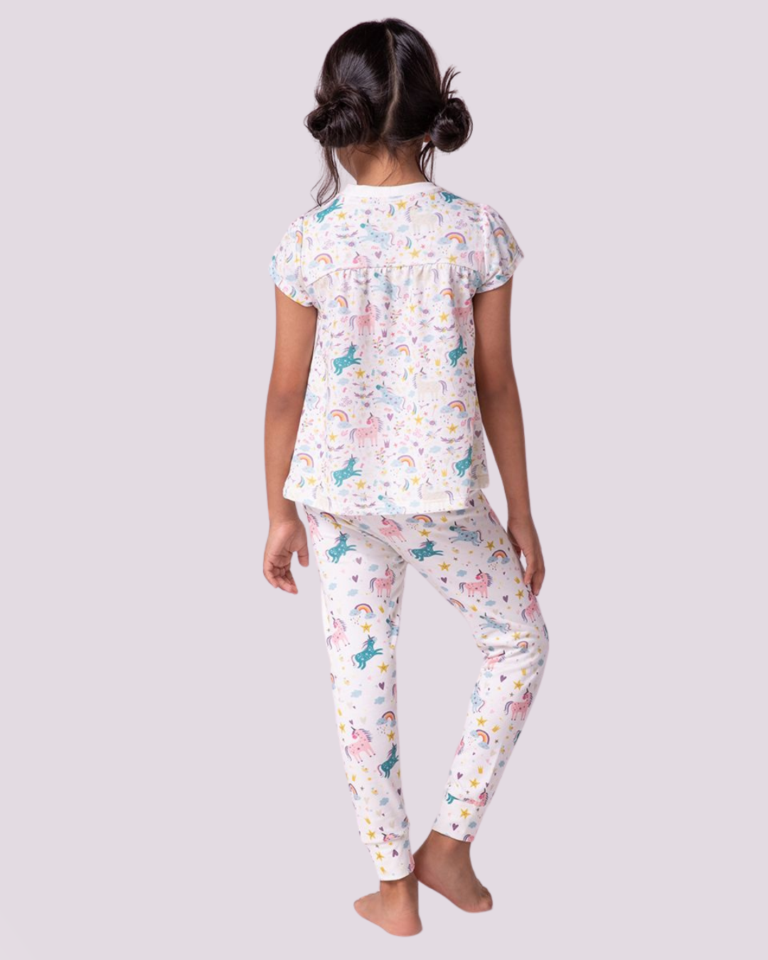 Pijama Lupo com estampa de unicórnios e arco-íris, feito em malha macia para noites leves, divertidas e cheias de magia.
