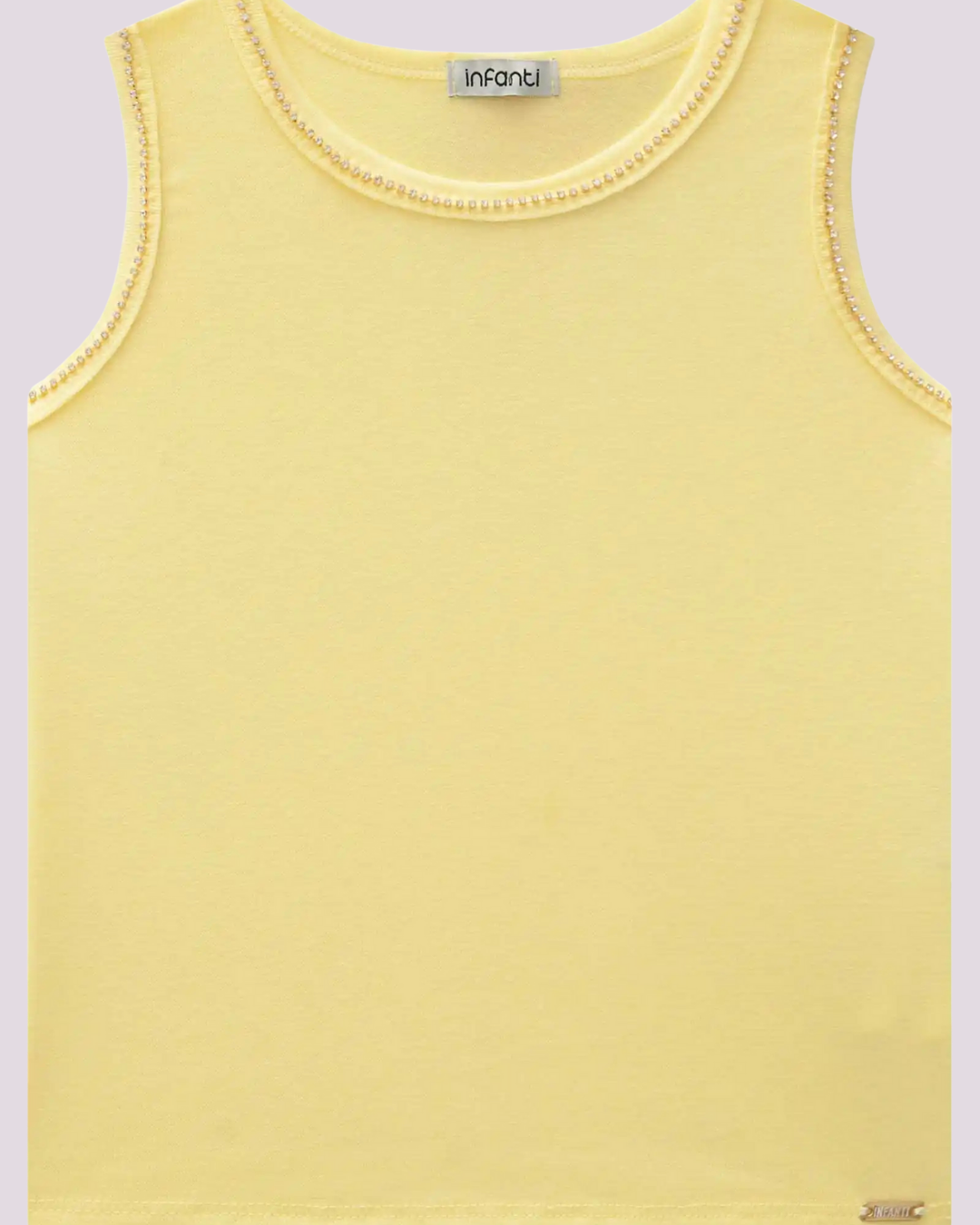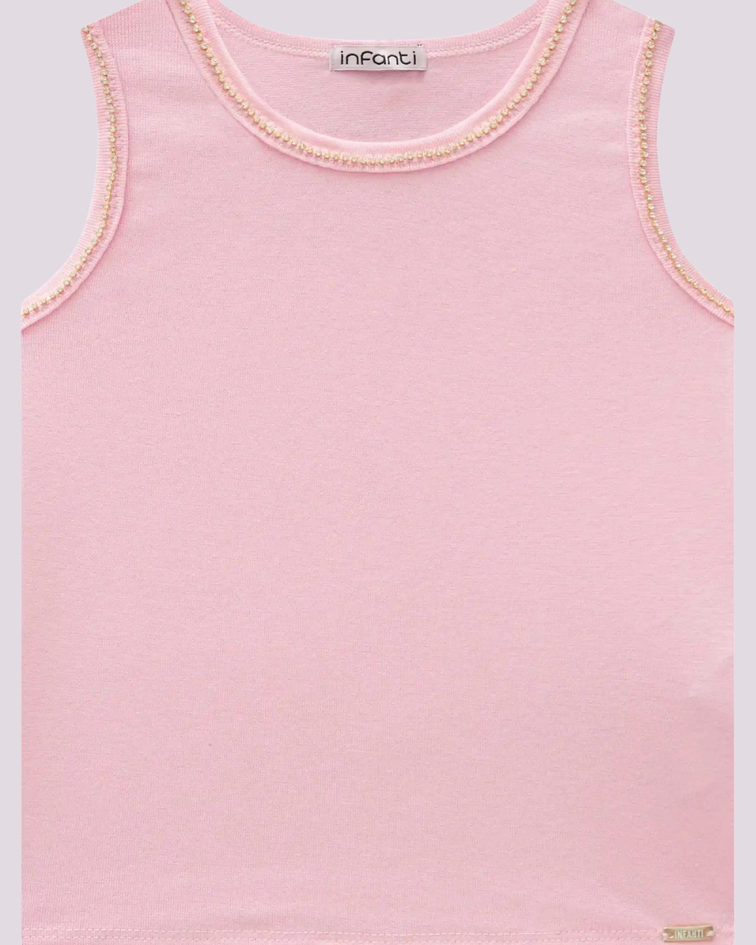 Delicadeza em cada detalhe! A Regata Rosa Infanti traz um toque sofisticado com acabamento em pérolas aplicadas na gola e nas cavas. Confeccionada em malha macia, é perfeita para compor looks confortáveis e cheios de charme — seja com shorts, saias ou calças leves.