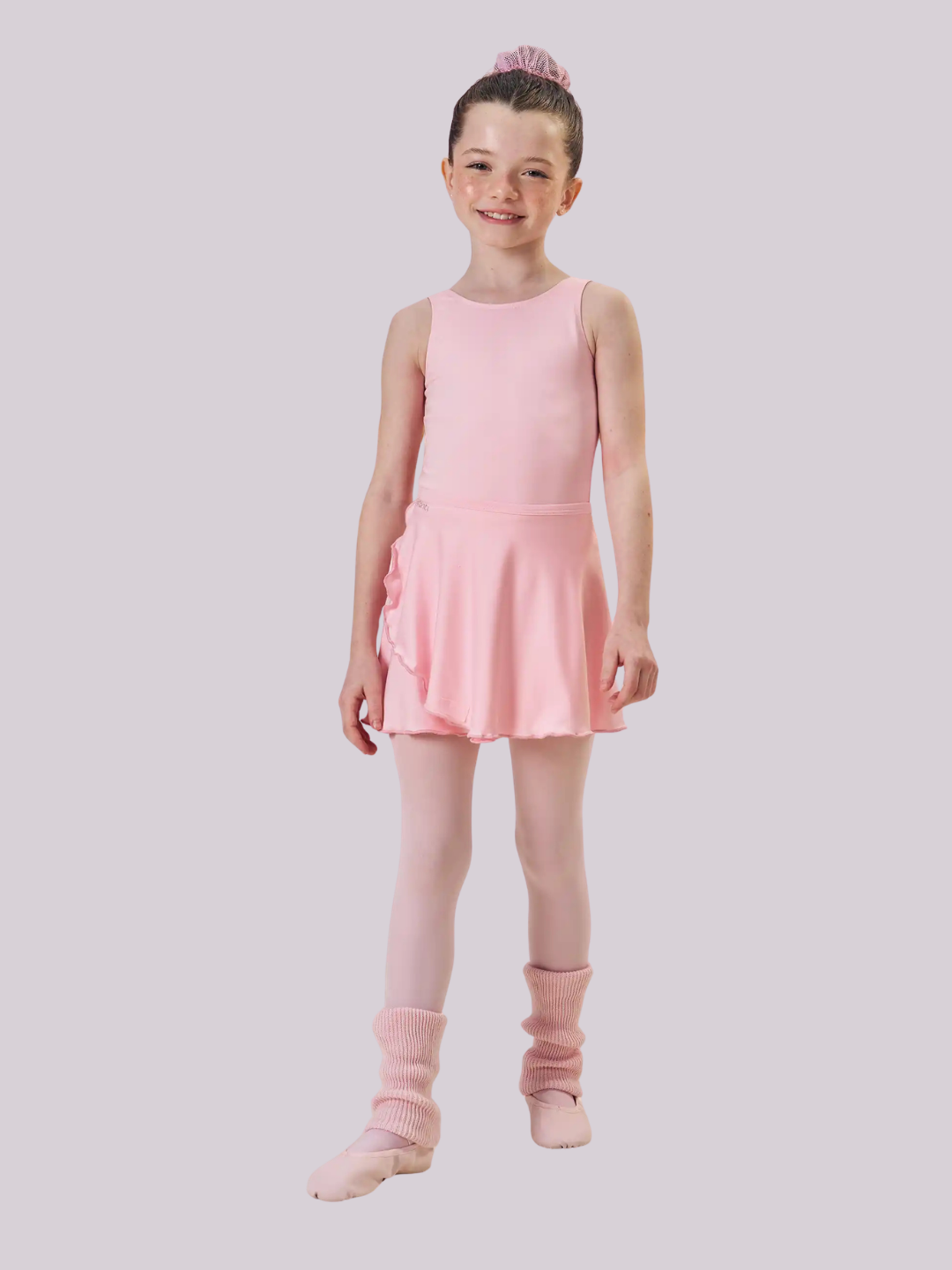 Saia infantil rosa com recorte assimétrico e caimento fluido, delicada e cheia de movimento.