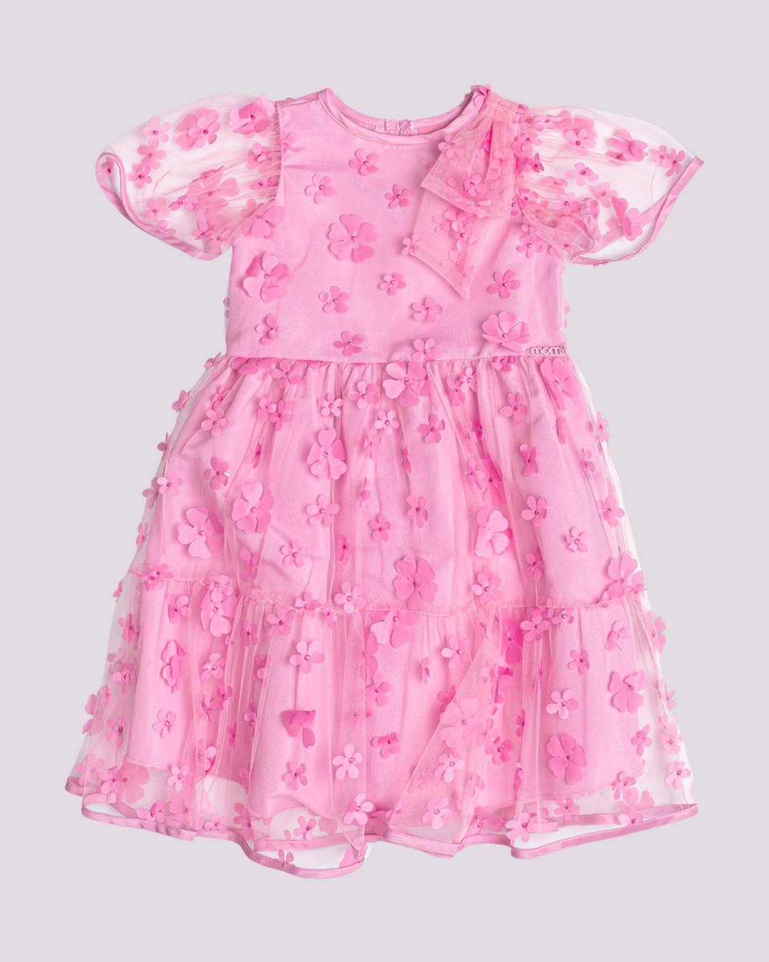 Vestido infantil rosa confeccionado em tule delicado com aplicações florais em 3D, trazendo volume e sofisticação. Possui mangas curtas transparentes, saia em camadas e forro confortável, perfeito para ocasiões especiais que pedem um toque de encanto.