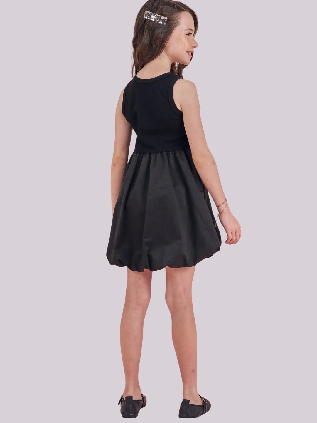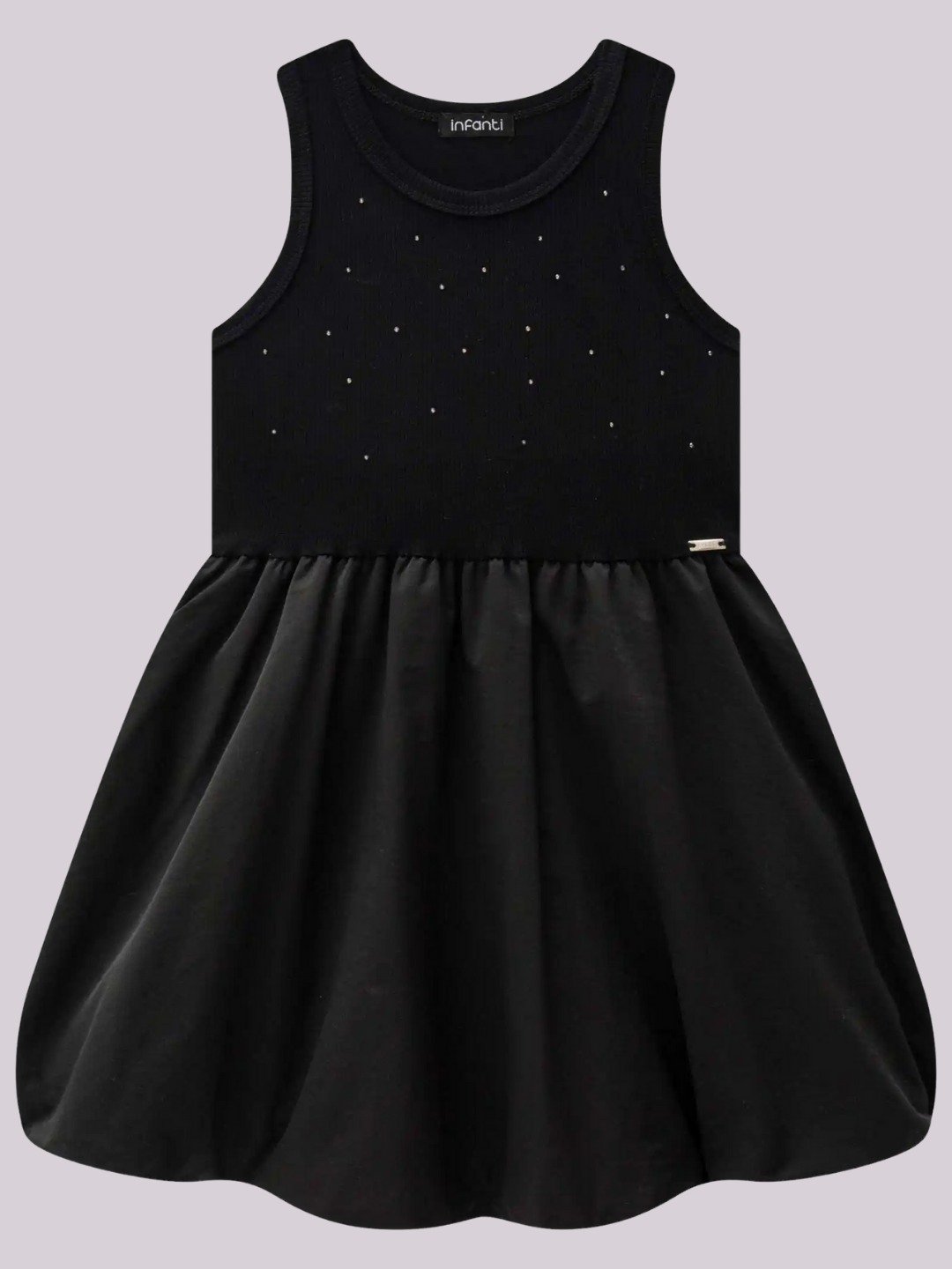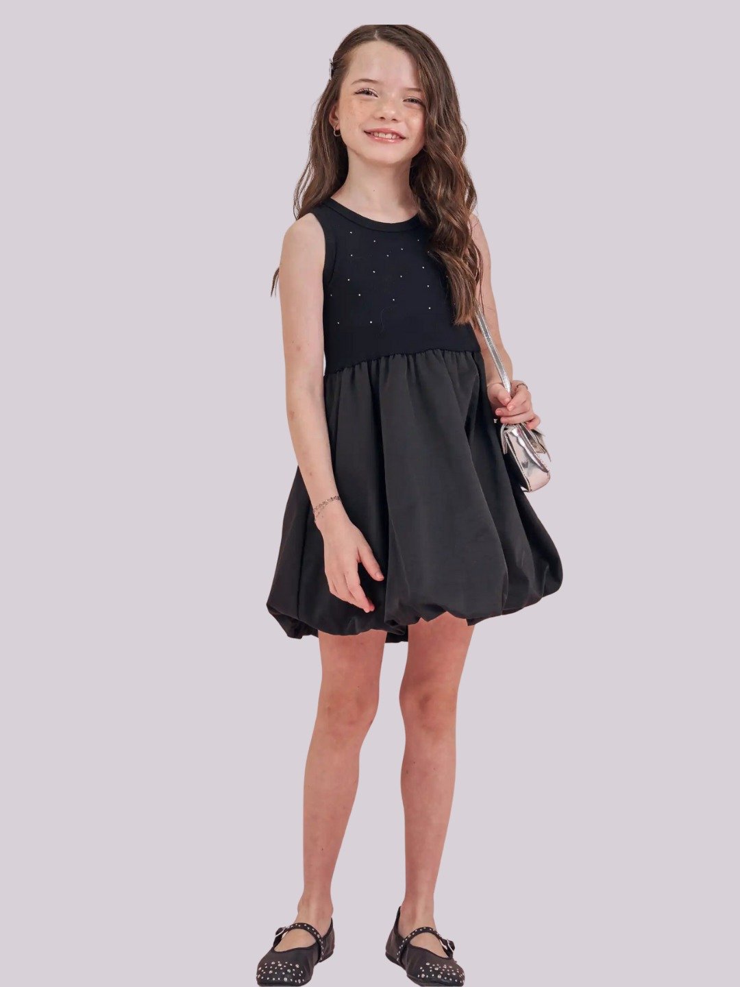 Vestido infantil preto com aplicação de strass e saia fluida, elegante e confortável para diversas ocasiões