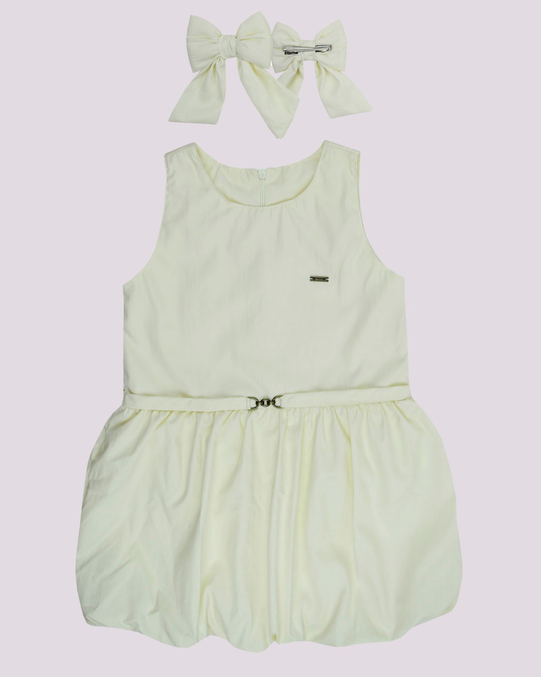 Delicado e elegante, o vestido off white é a escolha ideal para ocasiões especiais. Confeccionado em tecido leve e estruturado, traz modelagem com saia levemente balonê e detalhe de cinto com fecho metálico, que adiciona um toque refinado. Acompanha dois laços em tom coordenado, perfeitos para completar o look com charme e harmonia.