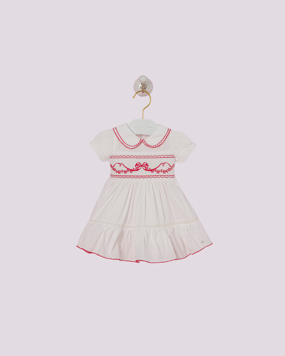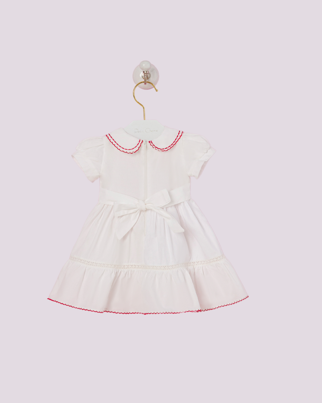 Vestido Petit Cherie branco com bordado vermelho e gola peter pan — um clássico encantador para ocasiões especiais