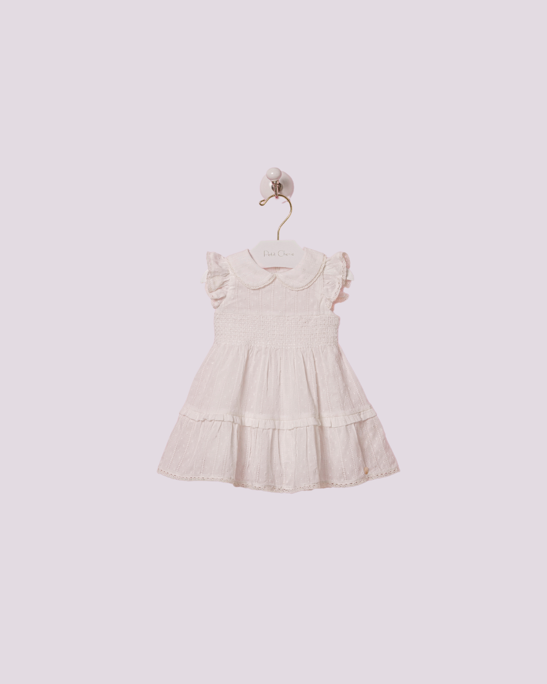 Vestido Petit Cherie branco com gola Peter Pan e saia rendada, delicado e elegante para momentos especiais.