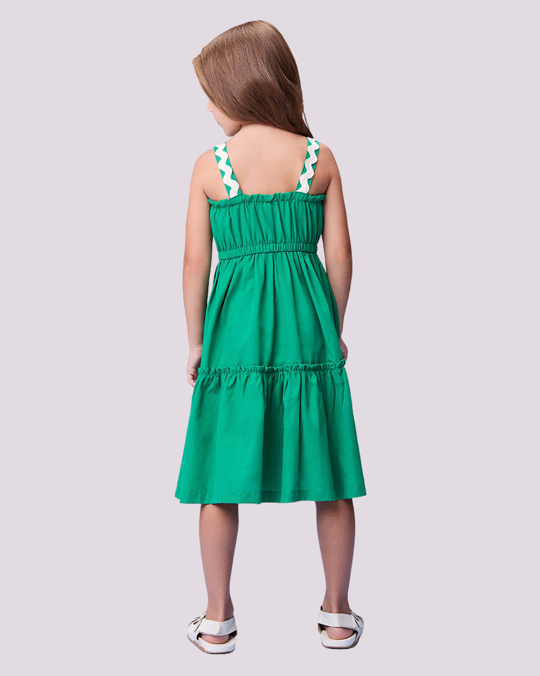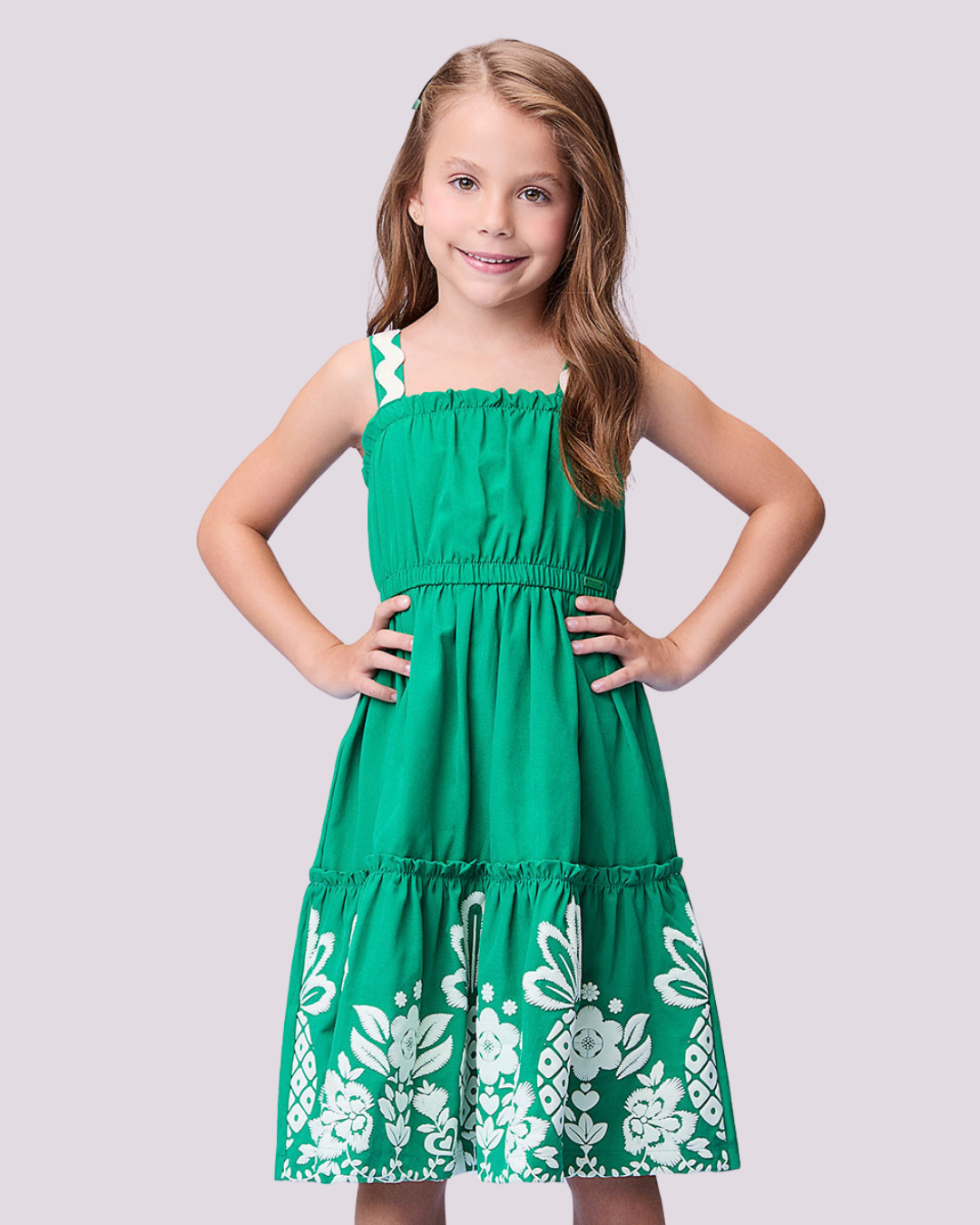 Vestido infantil Momi confeccionado em Tex Cotton, com delicada estampa em puff na cor verde puro. Ideal para ocasiões especiais, combina sofisticação e conforto em uma única peça.