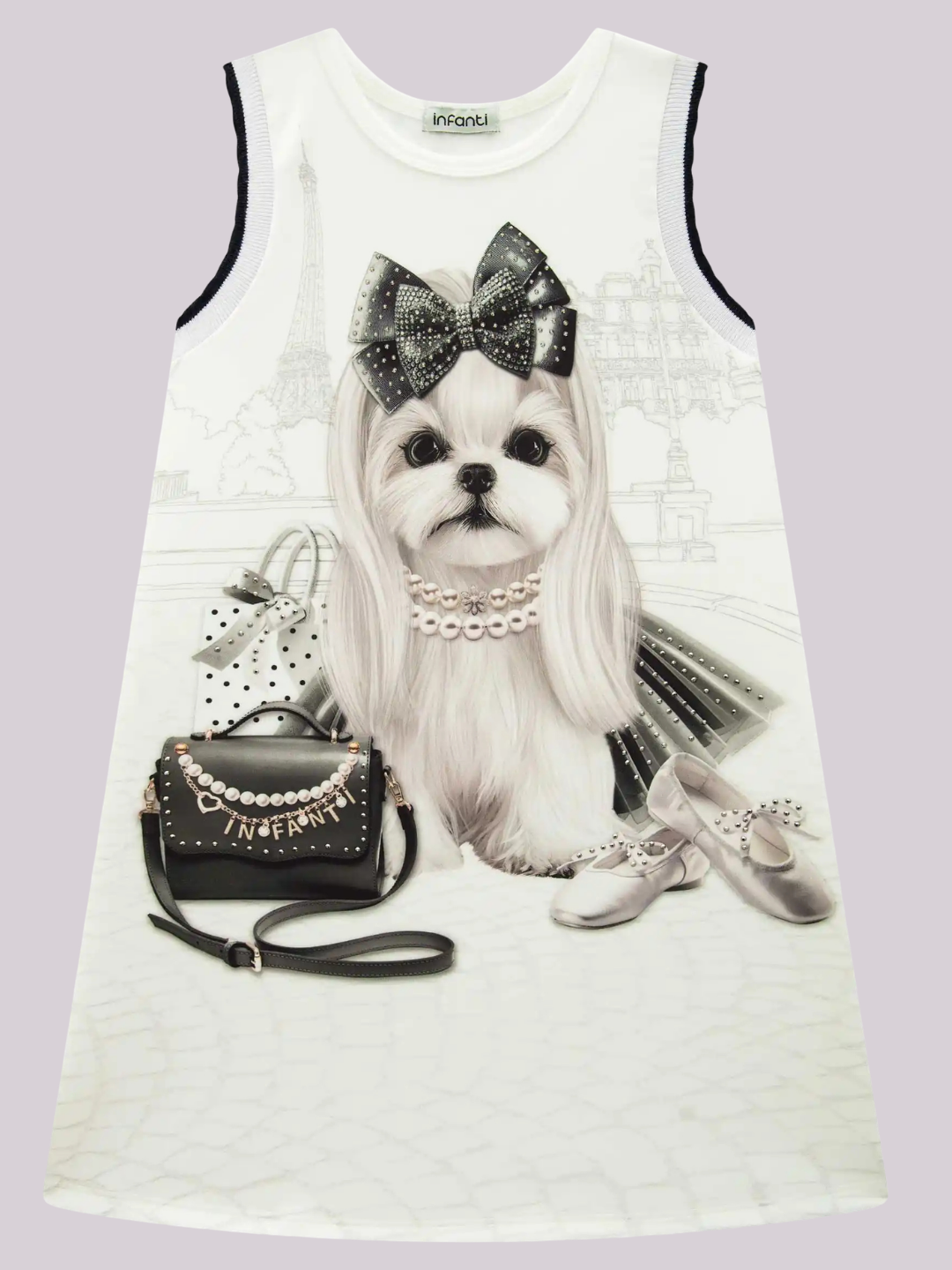 Vestido infantil off white com estampa fashion de cachorrinha e detalhes delicados, perfeito para meninas que amam charme e estilo.