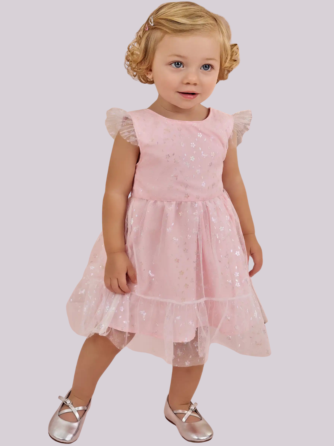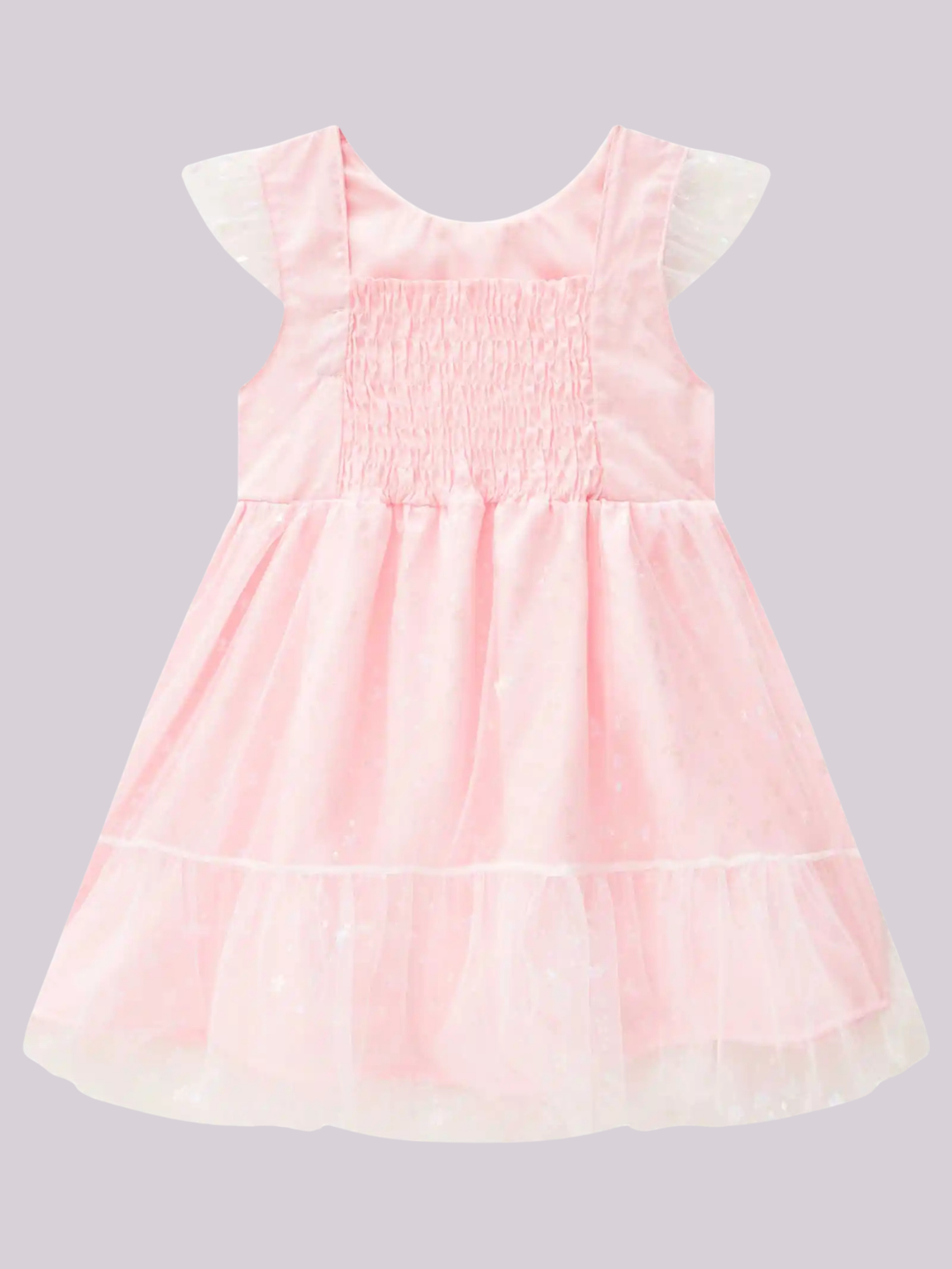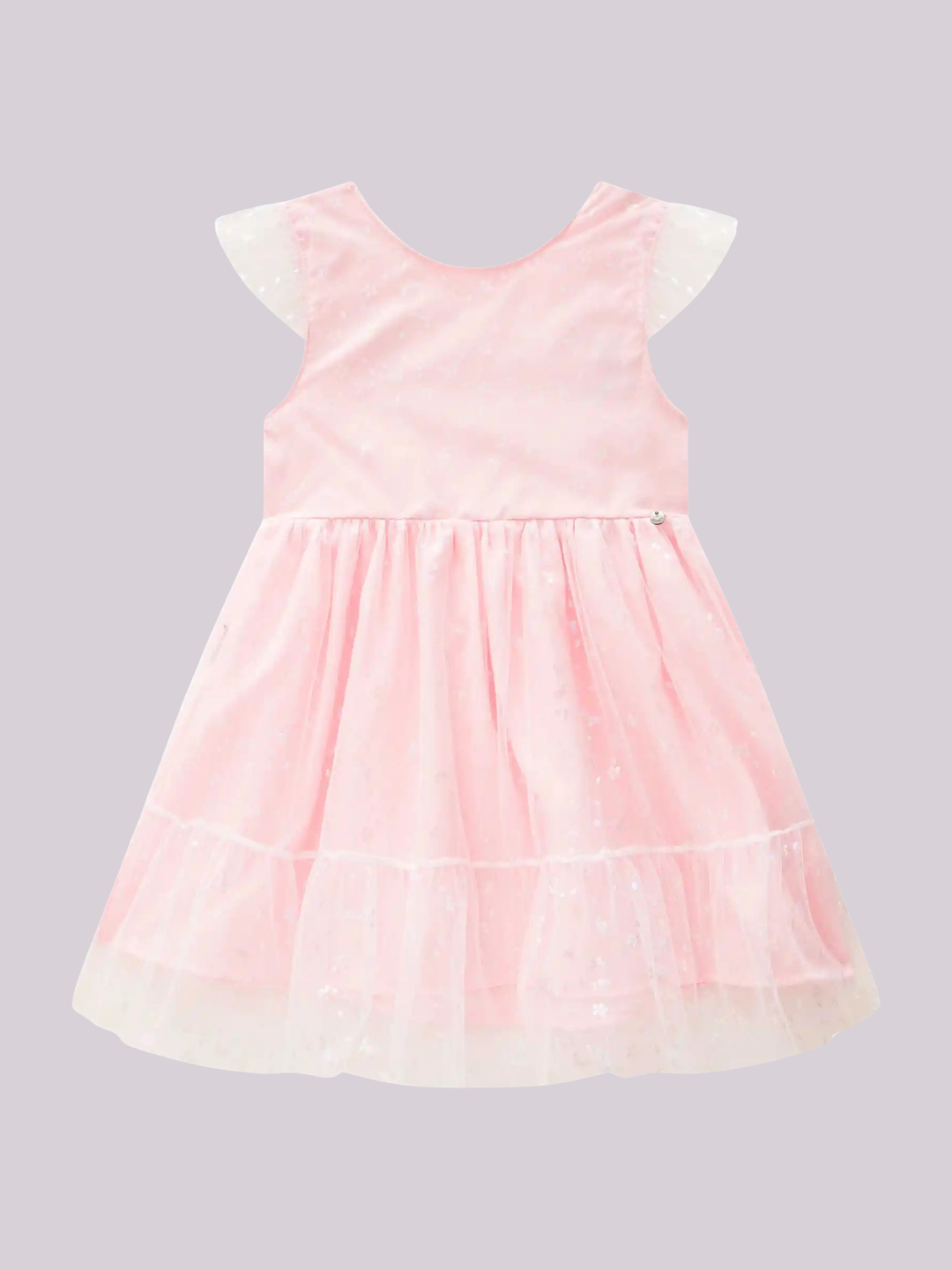 Vestido infantil rosa com sobreposição em tule e brilho delicado, leve, romântico e perfeito para ocasiões especiais.