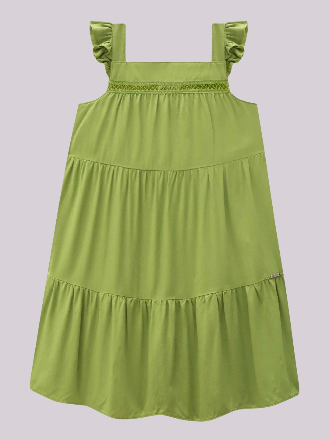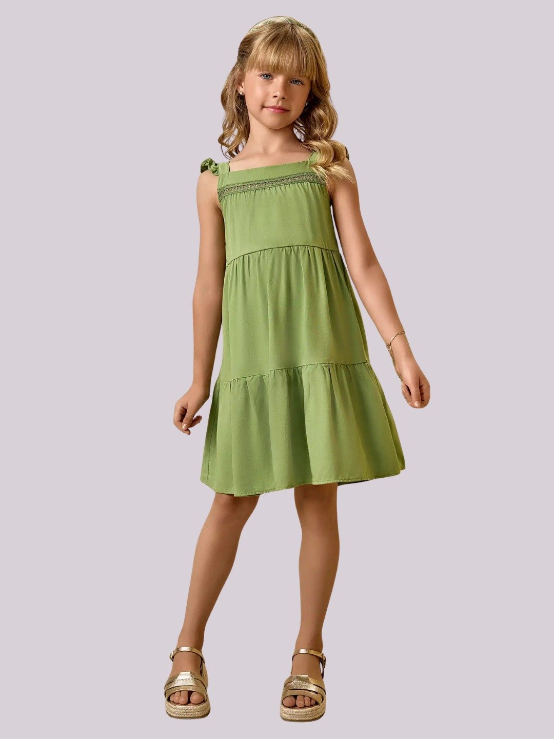 Vestido infantil verde com alças delicadas e saia fluida em camadas, leve, elegante e perfeito para dias ensolarados.