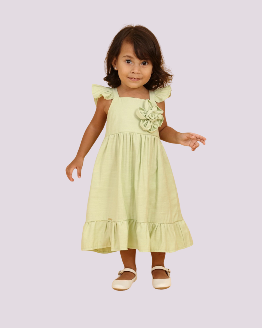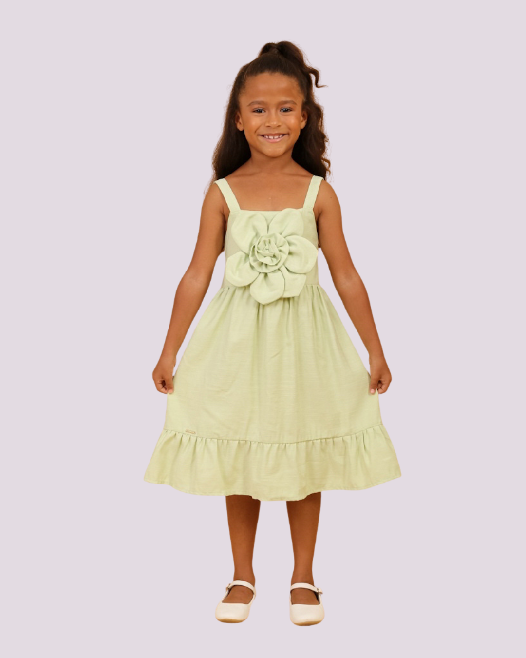 Vestido Flor Verde — romântico, leve e encantador. Um toque de natureza e alegria para iluminar o dia das pequenas!