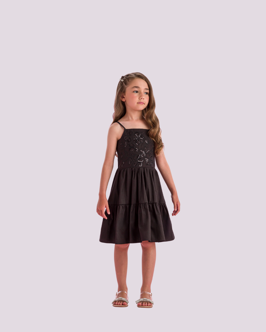 Vestido Petit Cherie preto com aplicações delicadas e caimento leve — elegância e charme para ocasiões especiais.