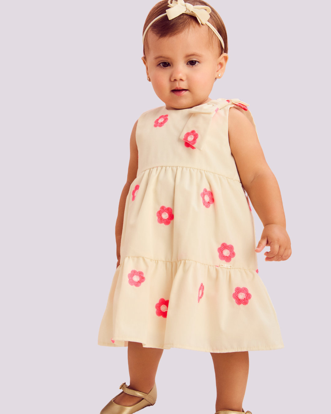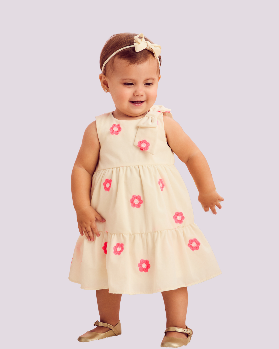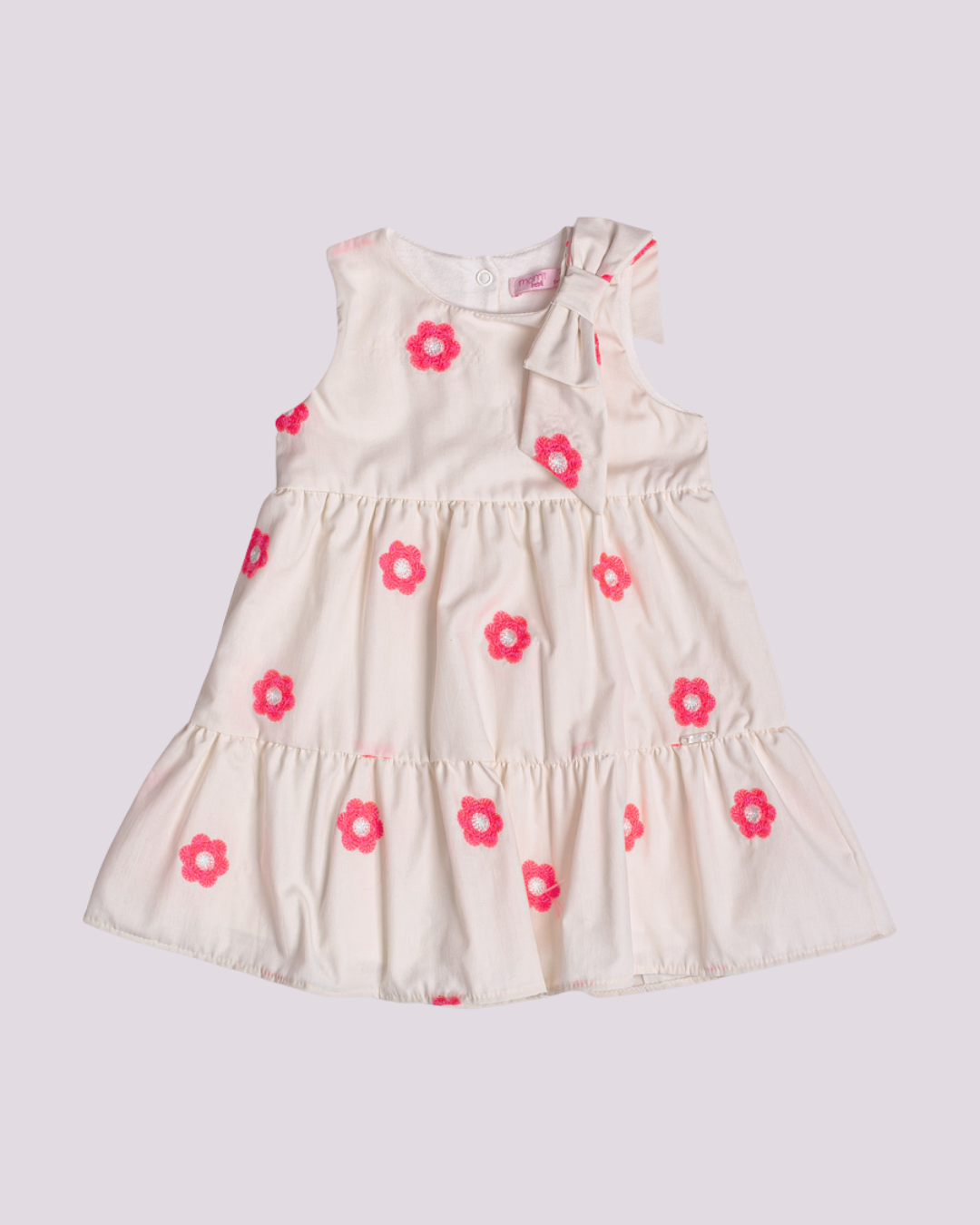Vestido bege Momi com bordados de flores rosas e detalhe de laço, perfeito para momentos especiais.