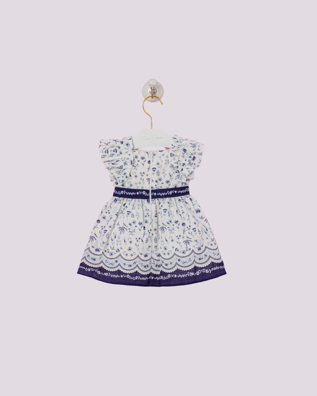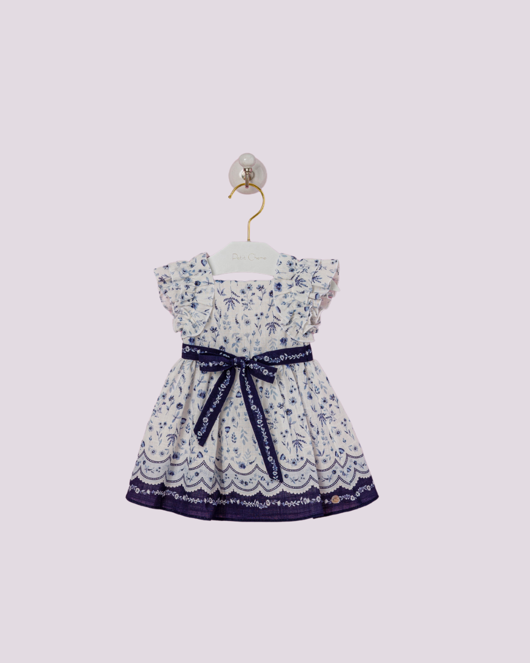 Vestido Petit Cherie com estampa floral azul e laço — um toque de charme e elegância para momentos especiais.