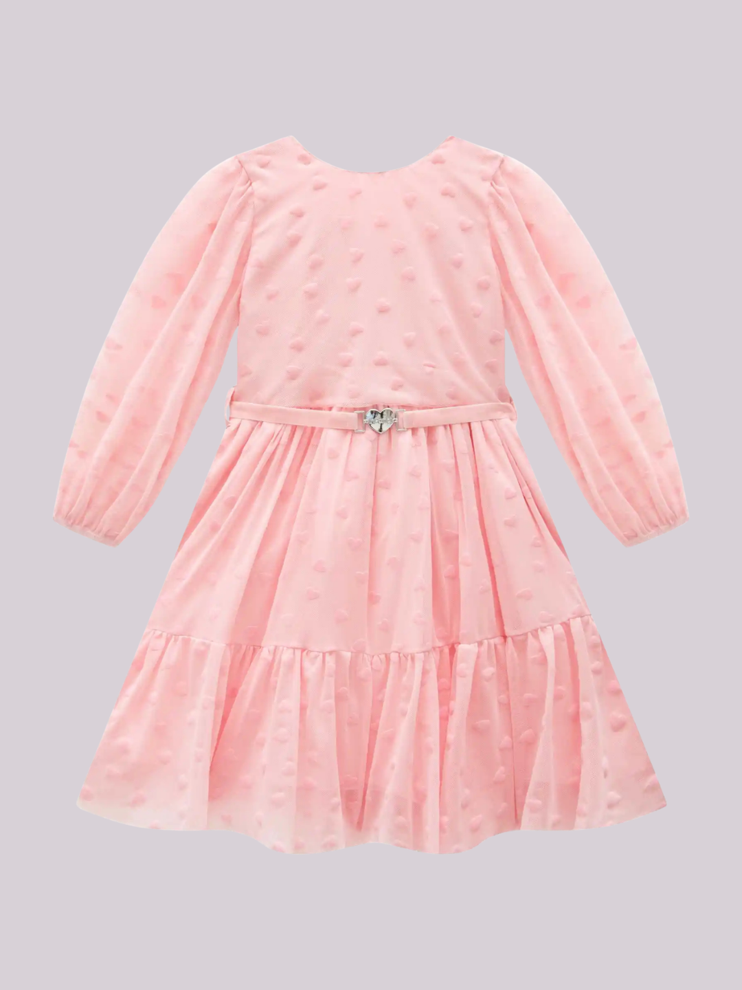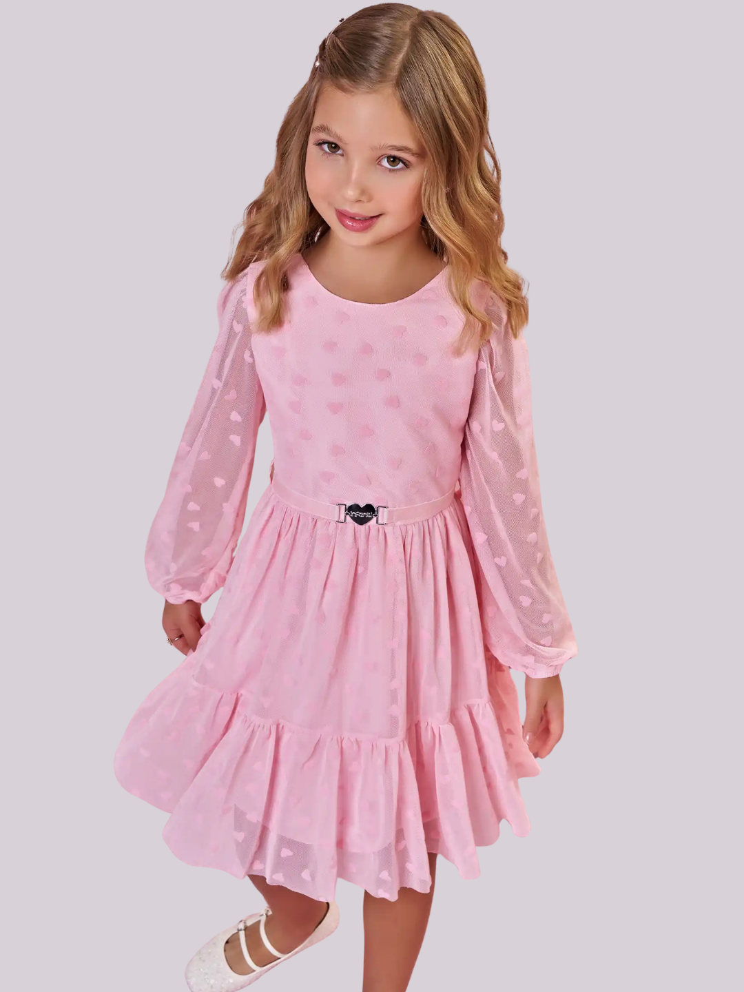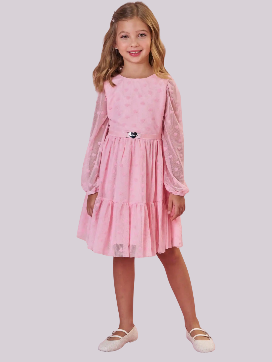 Vestido em tule rosa com textura de corações, mangas delicadas e cintura marcada com detalhe de coração, ideal para looks elegantes e encantadores.