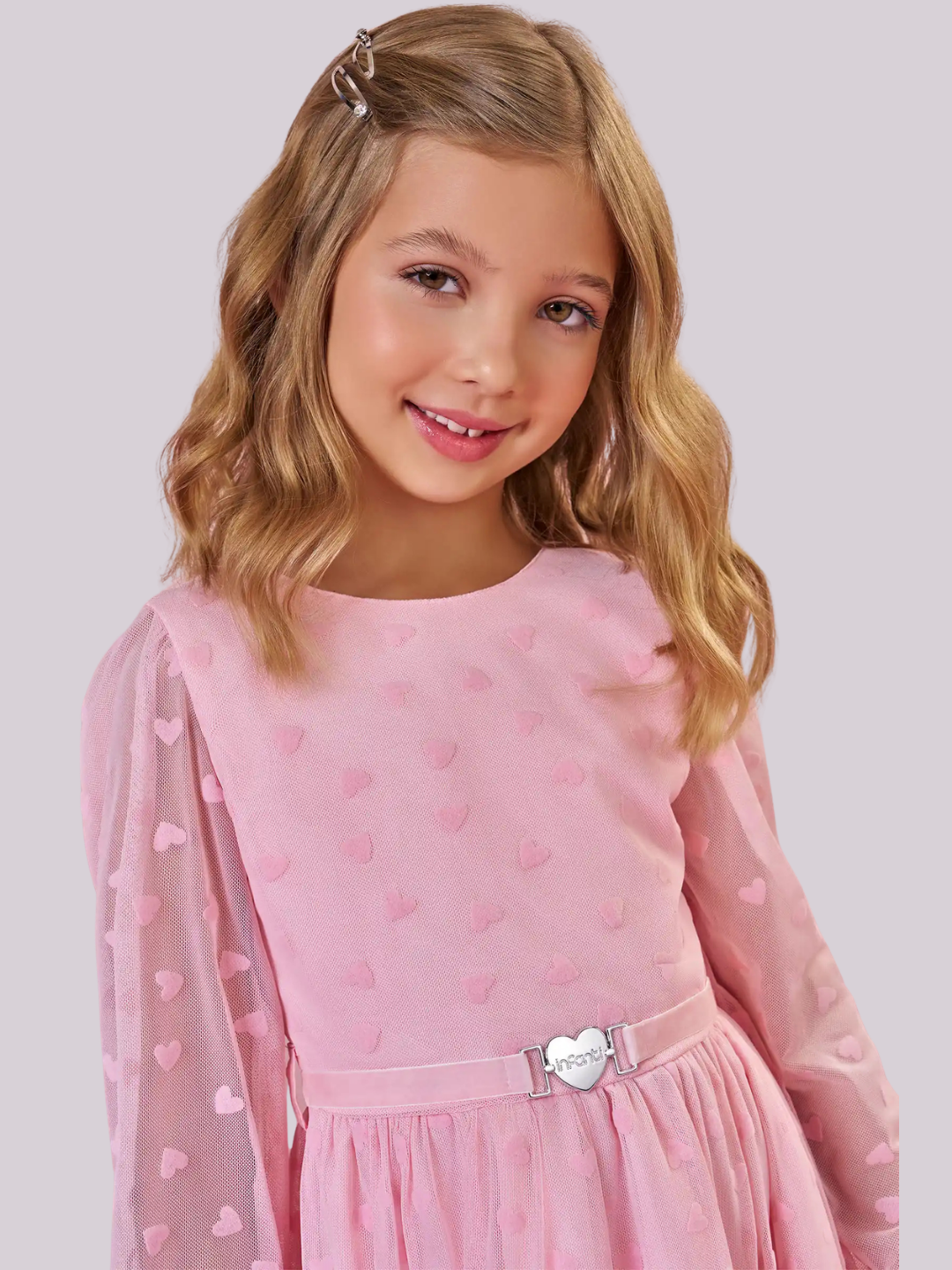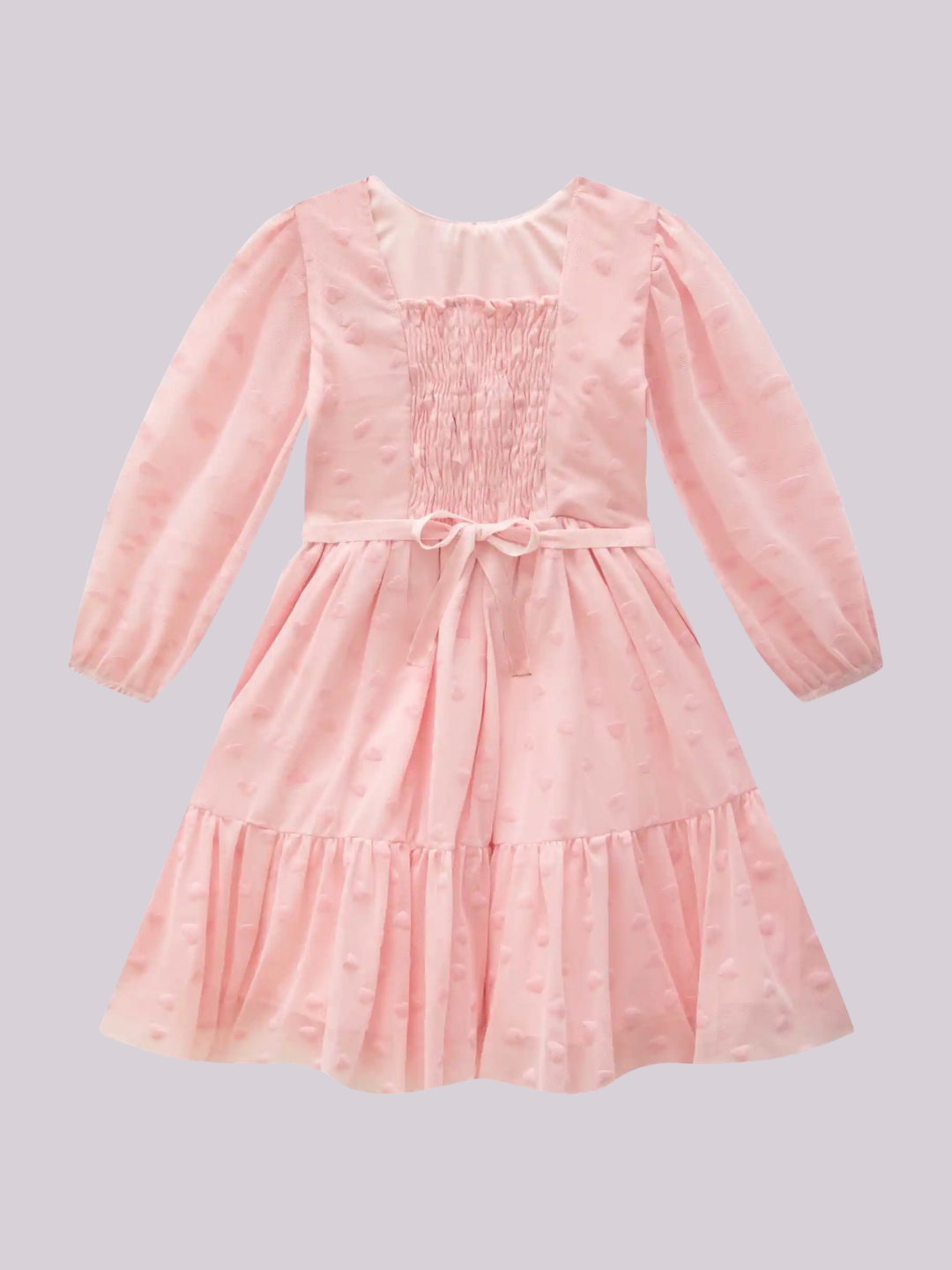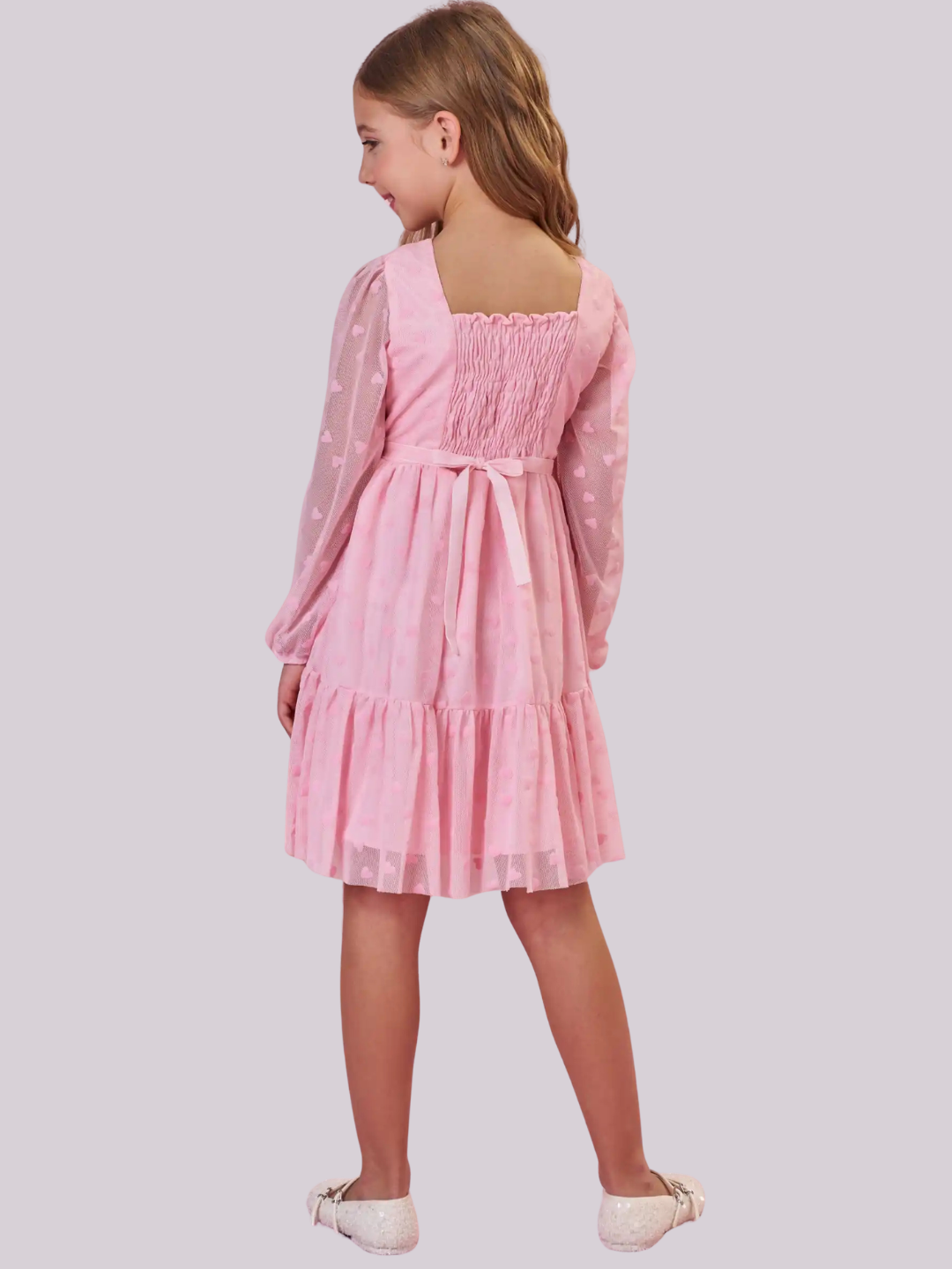 Vestido em tule rosa com textura de corações, mangas delicadas e cintura marcada com detalhe de coração, ideal para looks elegantes e encantadores.