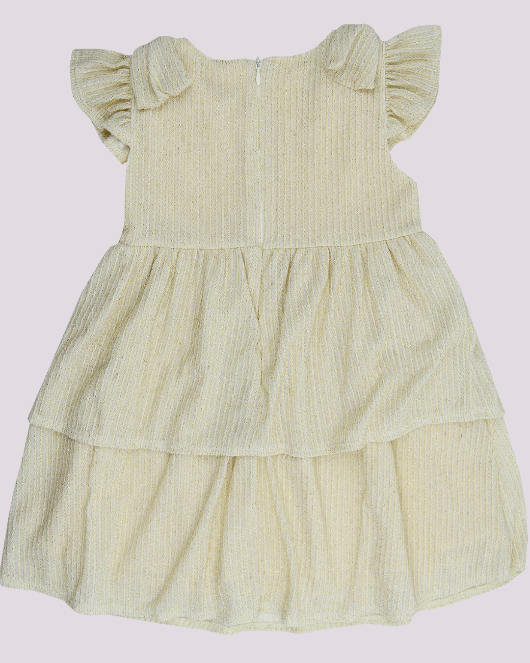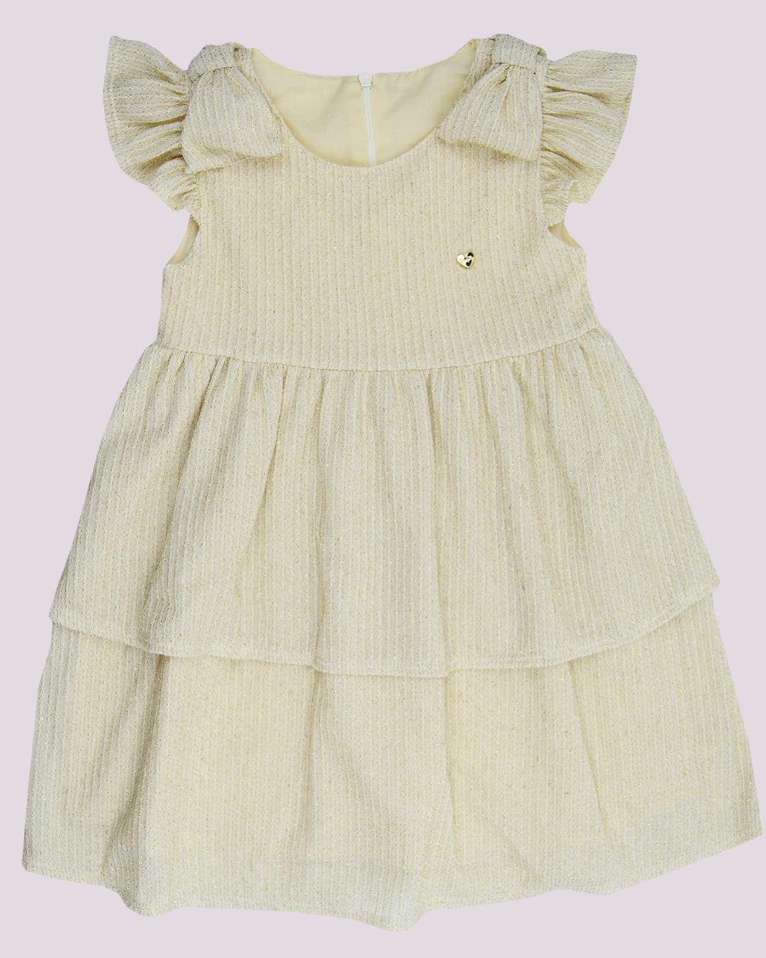 Um encanto em forma de vestido! O modelo Grow Up traz um delicado tecido dourado com leve brilho e textura em listras sutis, perfeito para ocasiões especiais. O design conta com babados em camadas e laços nos ombros, que deixam o visual ainda mais gracioso e sofisticado. Ideal para celebrar com charme e conforto.
