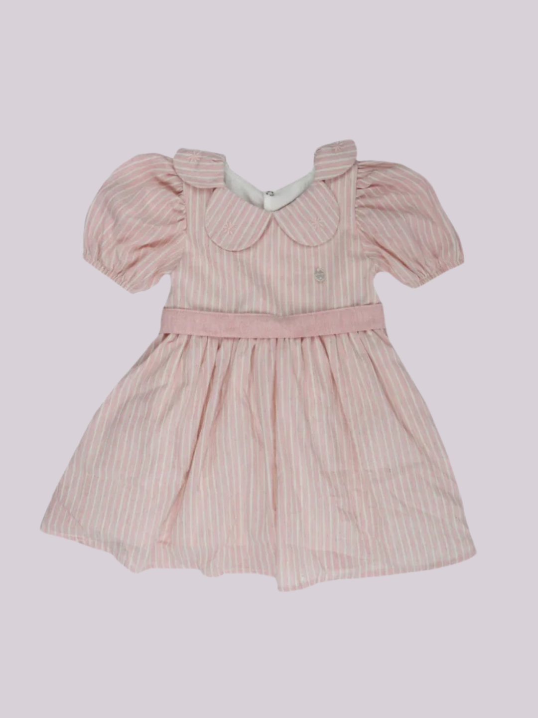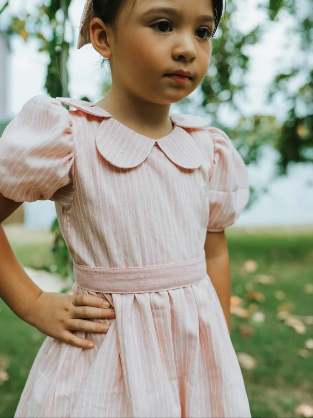 Vestido infantil rosa listrado, com mangas bufantes e detalhe delicado na gola. Leve, confortável e cheio de charme.