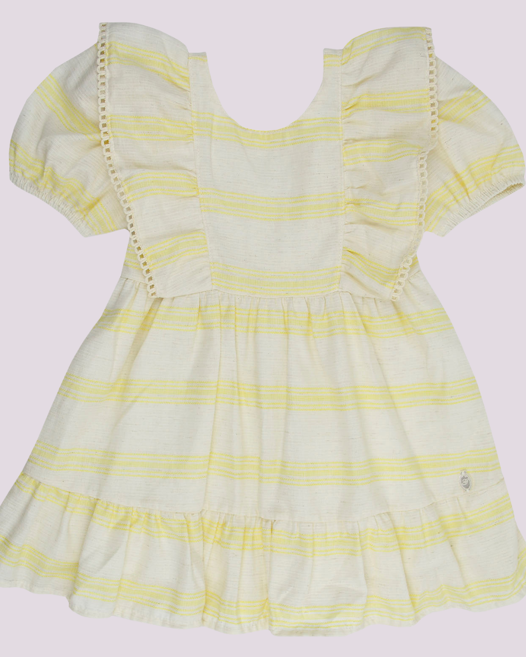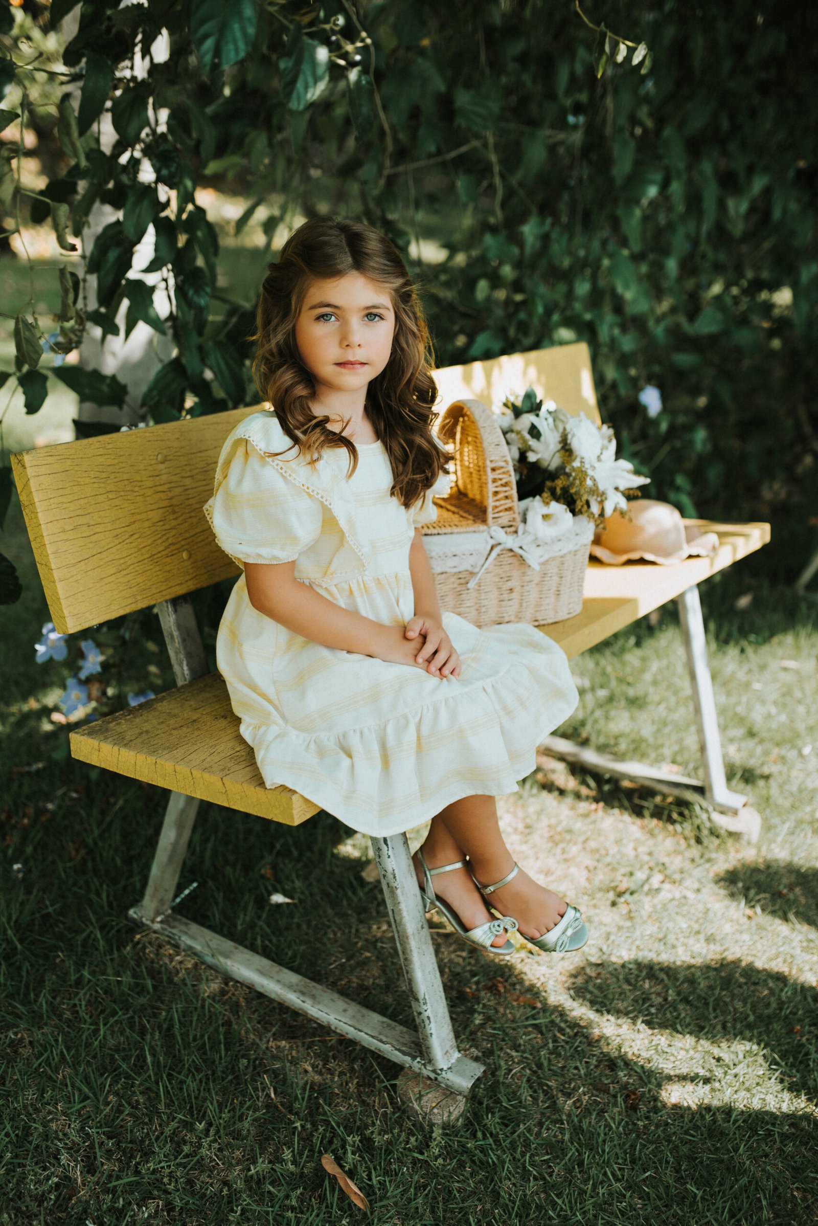 O charme das tardes ensolaradas em um look cheio de leveza! O vestido Grow Up traz listras amarelas suaves sobre fundo off white, com mangas bufantes e delicados babados nos ombros e na barra. O detalhe em renda vazada adiciona um toque artesanal e romântico, perfeito para dias de passeio e momentos especiais.