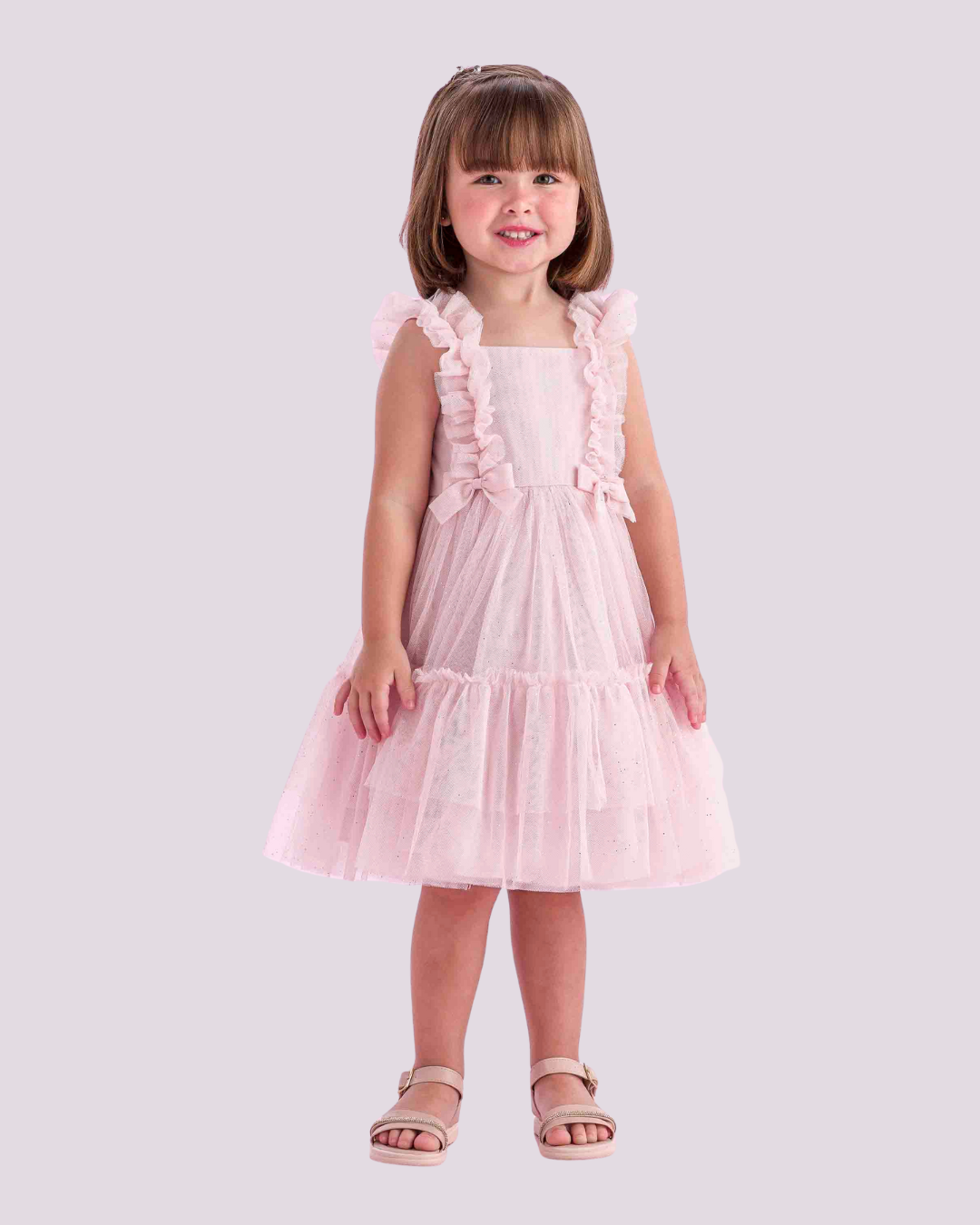 Vestido infantil Petit Cherie em tule rosa com poás delicados e aplicação de babados nas alças. Possui laços decorativos na cintura e saia em camadas que dão leveza e movimento ao look. Com forro macio e caimento impecável, é a escolha perfeita para ocasiões especiais com um toque de encanto e delicadeza.