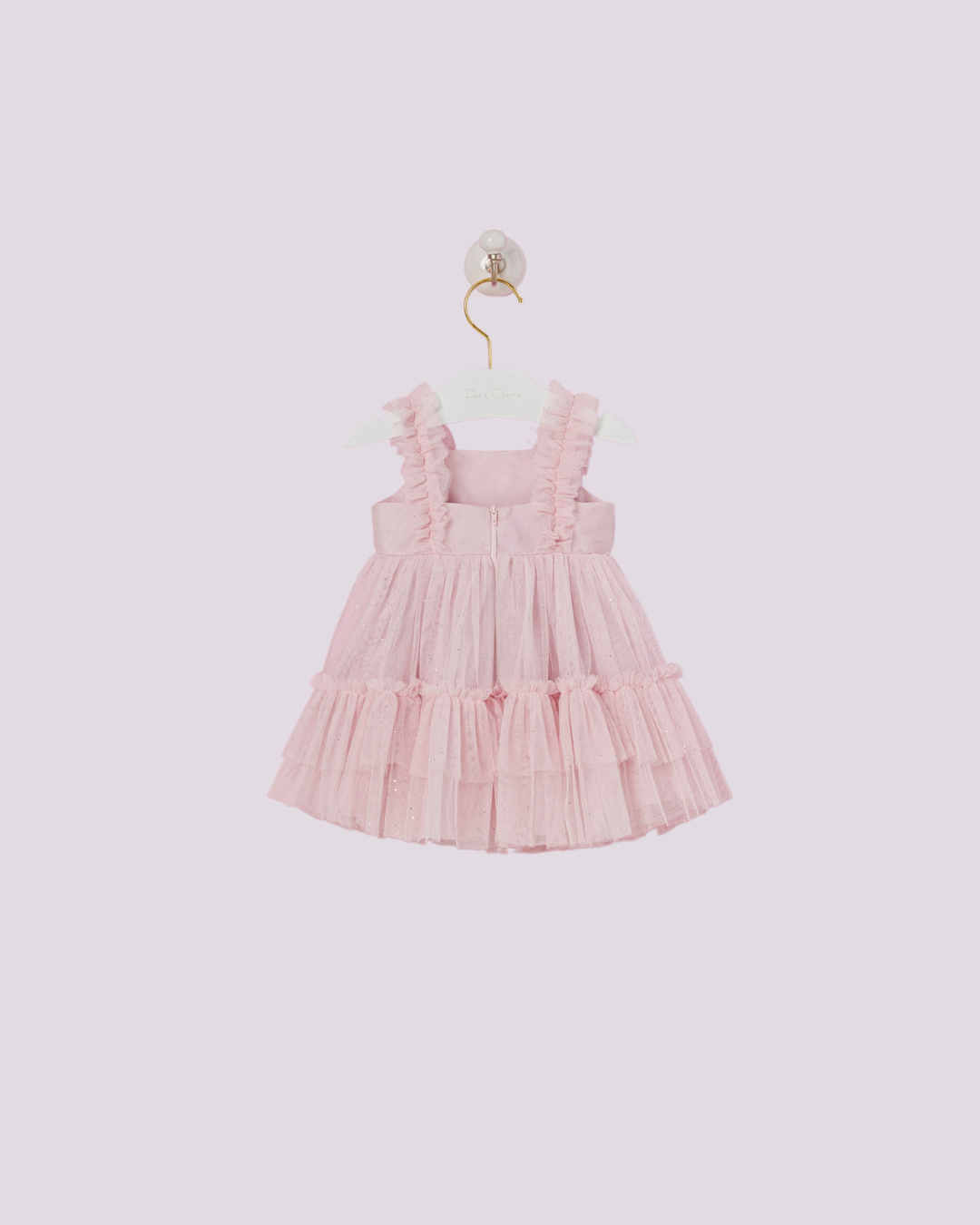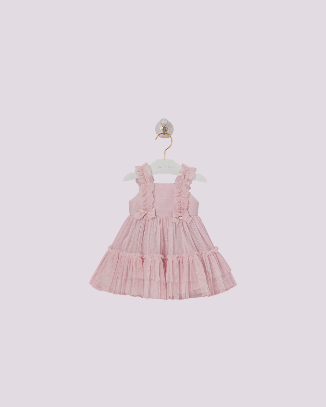 Vestido Petit Cherie rosa em tule com babados e laços, delicado e encantador para ocasiões especiais.